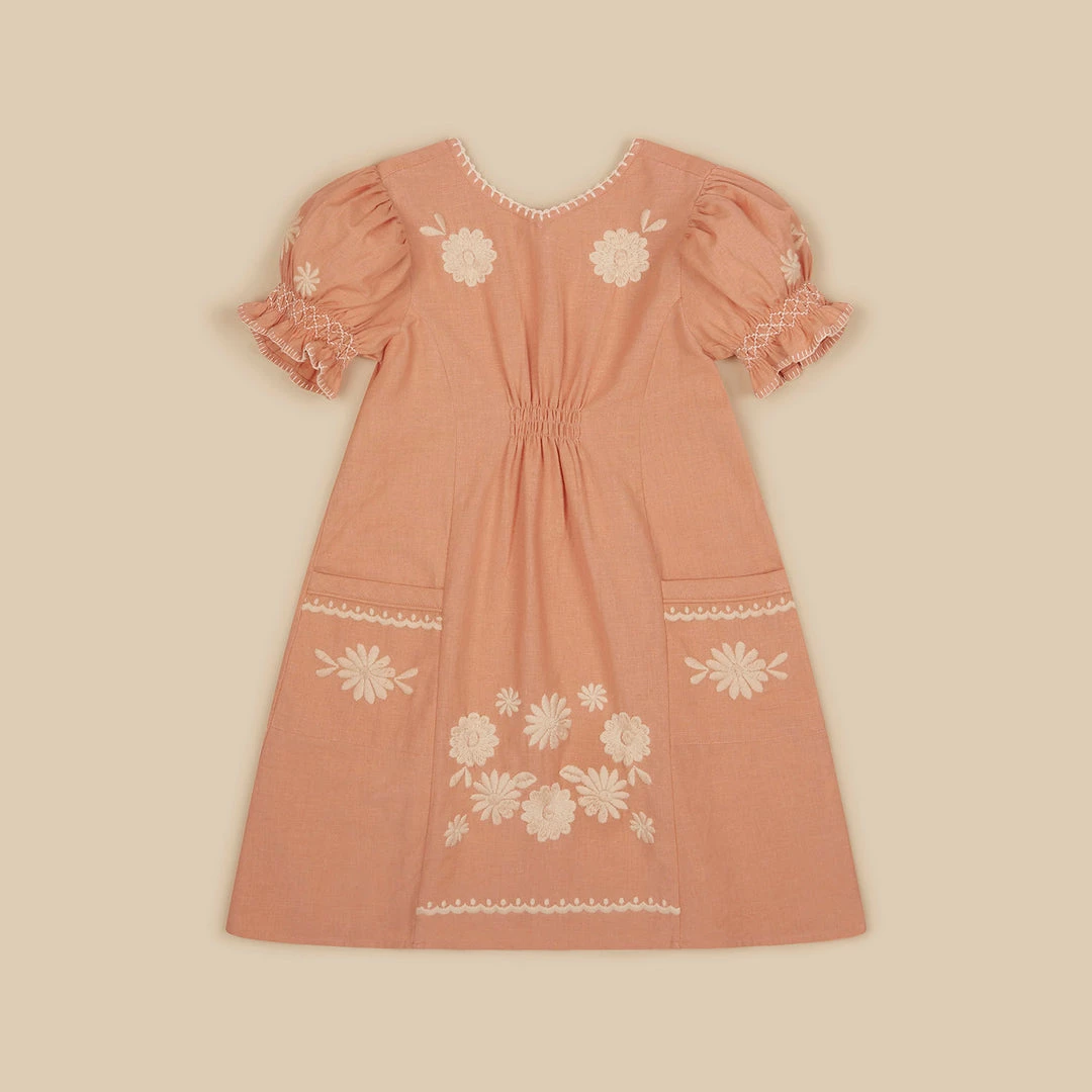 The Hana dress falls just over the knee, with a sweet elasticated ‘cinch’ at the waist. This design creates a sweet doll-like shape. Made from ‘ginger rose’ cotton with bold contrast embroideries in ‘ivory’, little pockets and hand smocking details at cuffs. Trimmed with hand blanket stitch at cuffs and hand crochet stitch at neckline. Featuring invisible zip at back. Hand wash recommended.