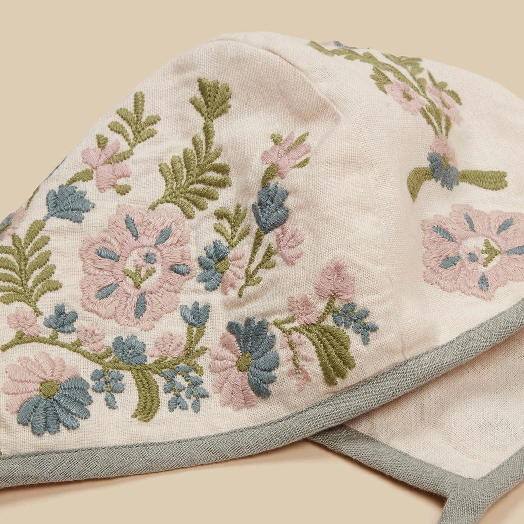 The Hilma bonnet in ‘shell’ features an intricate all over embroidery in the season’s pastel tones. This sweet bonnet offers shade from the sun or shelter from cooler breezes. Hand wash recommended.