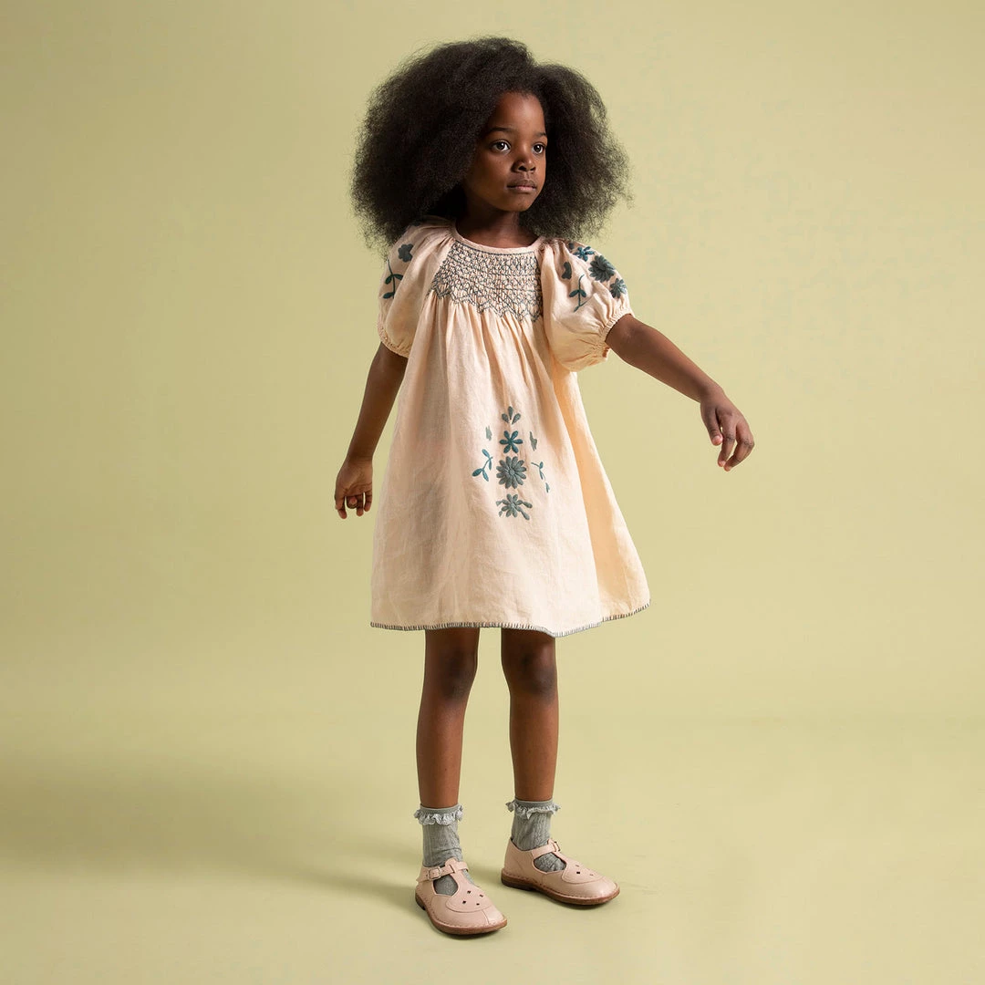 This new take on Apolina’s classic Maren dress comes in a soft ‘sweetpea’ linen. It is designed with dramatic puff sleeves with elasticated cuffs, hand smocking to chest and Maren’s signature naive bold embroidery to skirt and sleeve in multi-toned ‘pool’ shades. Featuring an invisible zip closure to back. Hand wash recommended.