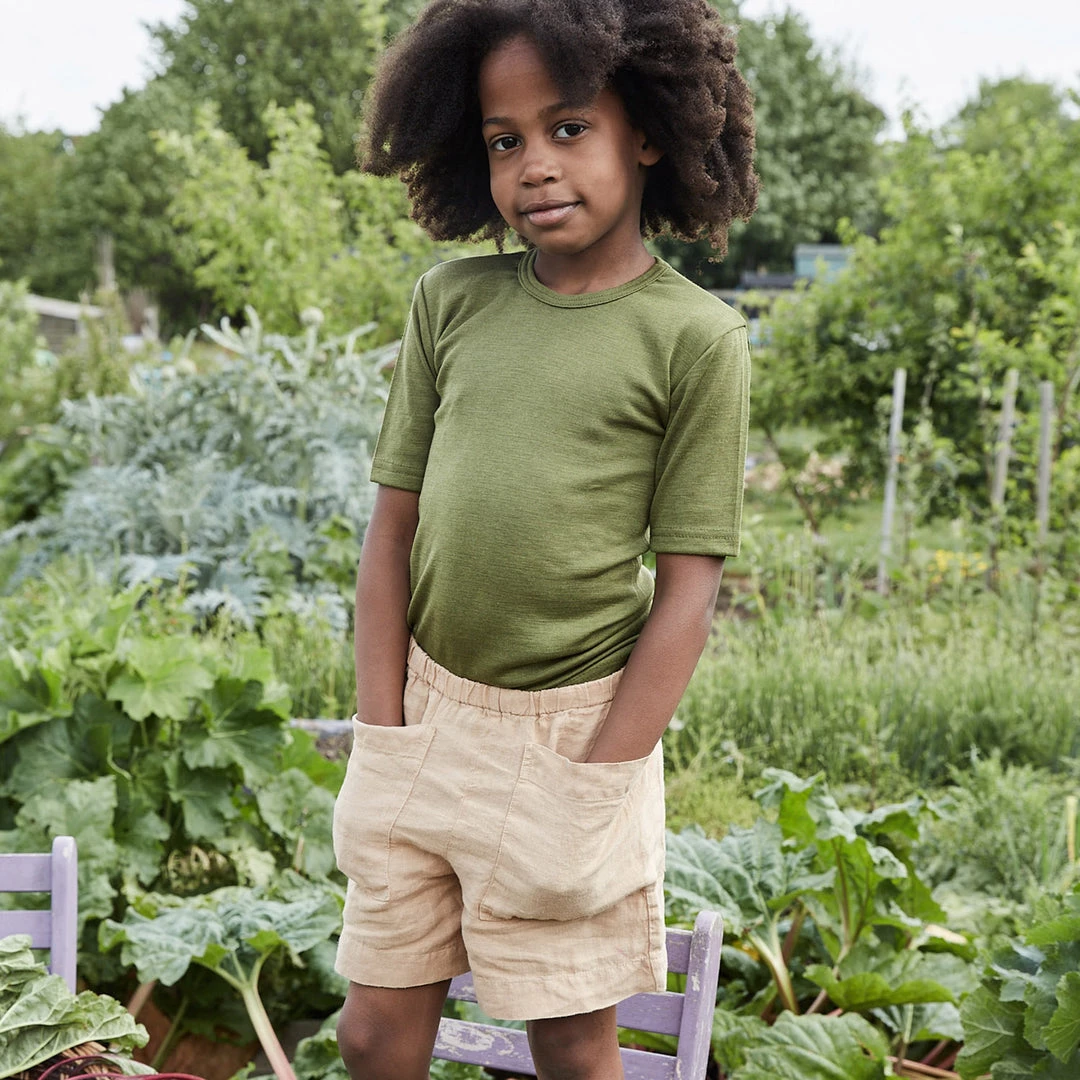 Pocket shorts in a lightweight linen, perfect for summer adventures. Features two practical pockets and an elasticated waist for a comfortable fit.