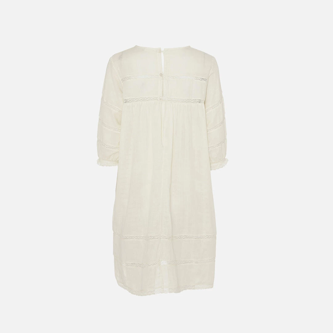 Long-sleeve organic cotton dress with lace detailing. Features buttons at back. Great dress for all year.