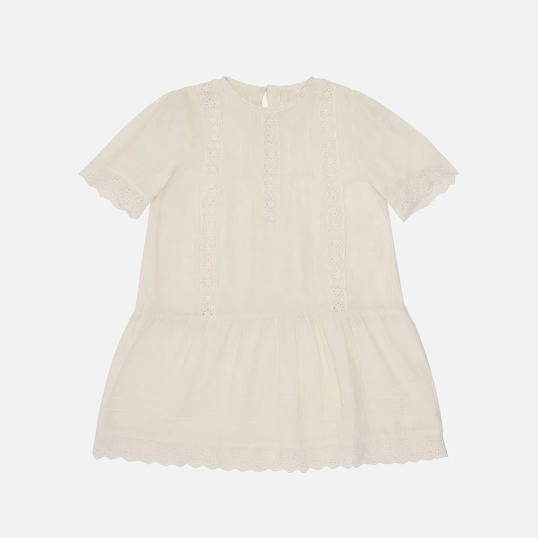 A sweet lightweight short sleeve dress with Broderie Anglaise detailing. Buttons at the back for ease of dressing. This dress makes a great summer dress and is perfect for special occasions.
