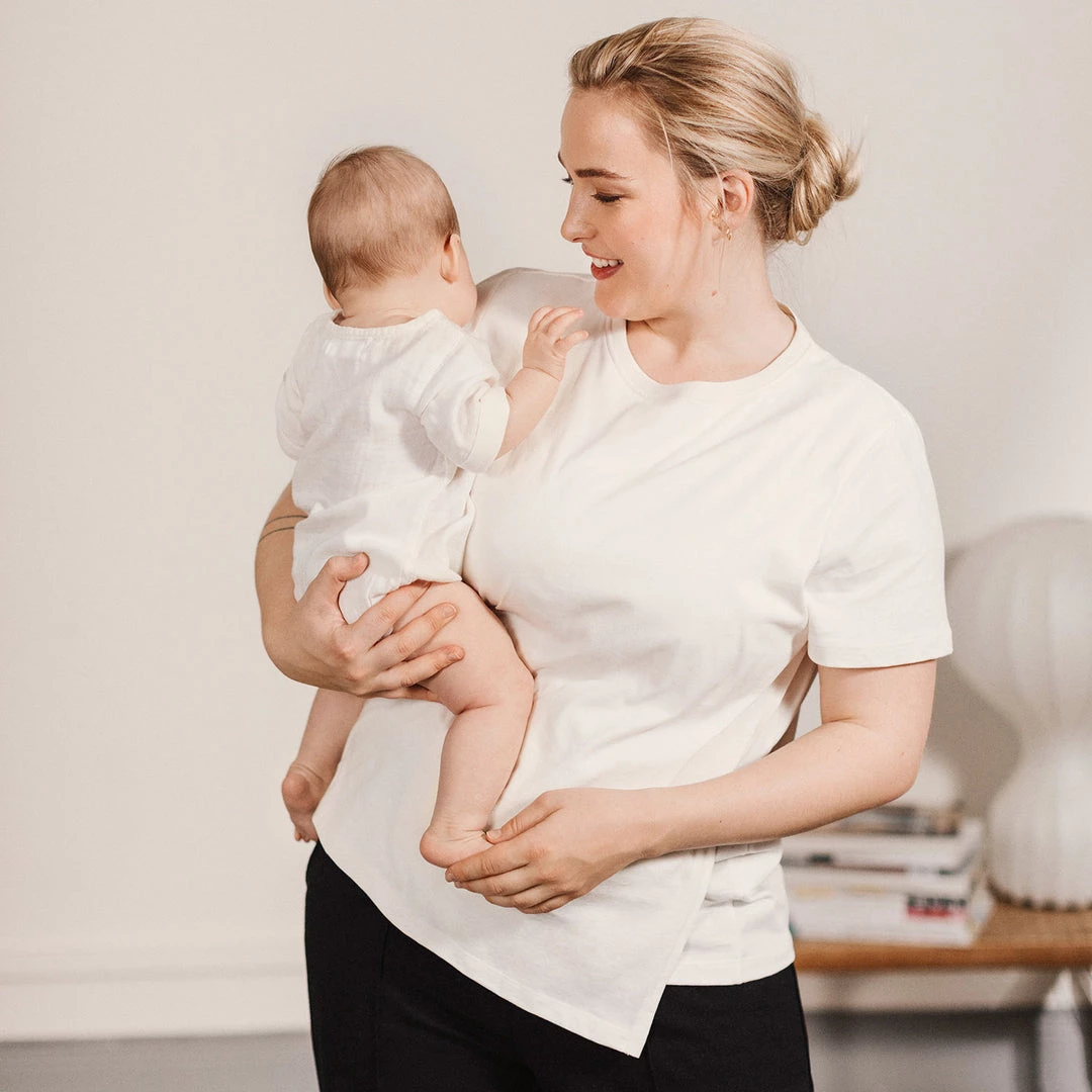 A classic yet incredibly versatile item. ‘The-Shirt’ is a brilliant basic on which to base your maternity wardrobe on. A wear everyday style that feels comfortable and relaxed thanks to the roomy fit. This style leaves space for changing figures and the double front section completely hides the nursing access. Just lift it to the side to reveal a vertical opening for easy breastfeeding. The garment in black has an “Almost black” tone. A great addition to your maternity wardrobe with functionality for use throughout pregnancy and nursing. Machine washable at 40 degrees.
