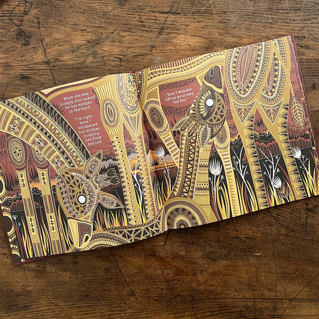 The rain clouds are long gone and the dry season scorches the land. Everything is new for the baby giraffe. As she bounds ahead and lags behind, her mother patiently explains the ways of the grasslands. And until she grows a little taller, older and wiser, her mother reminds her: “You’re strong with me’.
