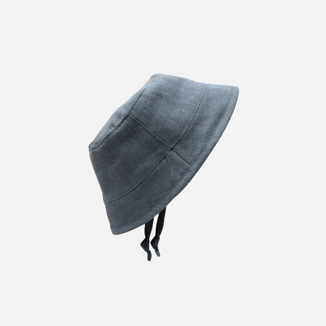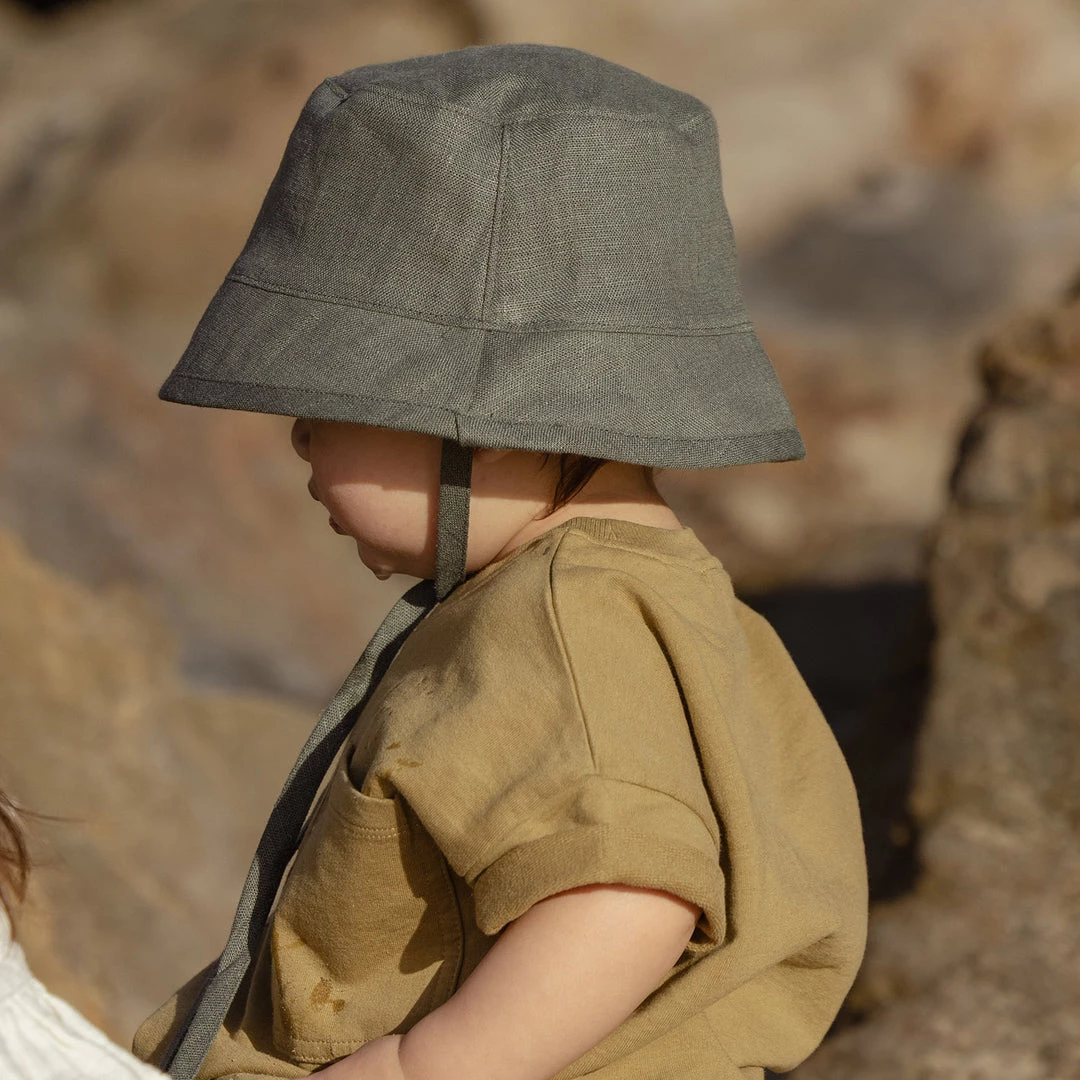 This linen bucket hat is super breathable which makes it an essential for the warm summer days. All-around brim provides effortless sun coverage. The 2-4y size features ties to ensure the hat stays in place. The 4y+ size is tieless for ease of wear for older children. Easy to style and wear.