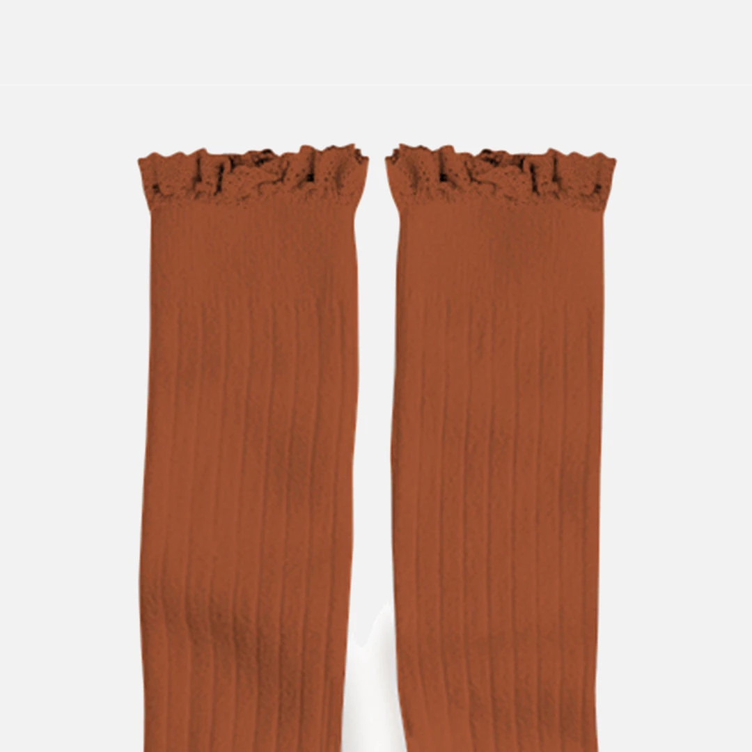 Comfortable, classic long socks in cinnamon with new cotton lace detail at the top. These socks are knitted using a blend of 84% egyptian cotton, 14% polyamide and 2% lycra/elastane for excellent elasticity.Â