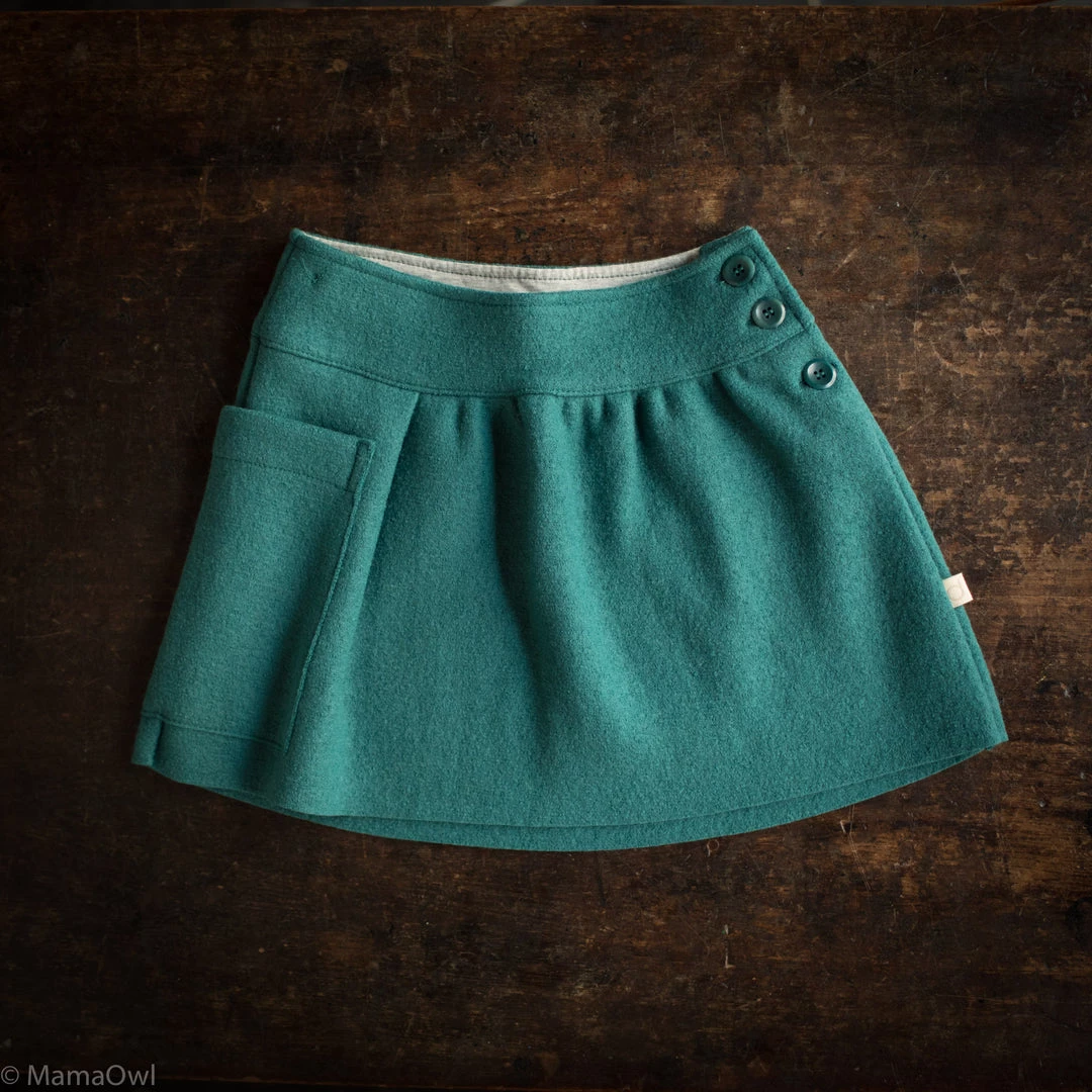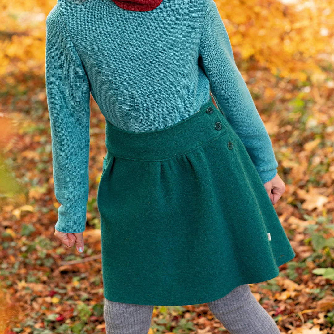This Autumn Disana brings back the boiled wool skirt style in a new updated design. Made from the soft classic Disana boiled wool, this skirt features a three button closure on the left hand side for easy fastening and a deep pocket on the right hand side. These are perfect for layering over our beautiful selection of wool tights and style back well with our classic Disana sweaters.