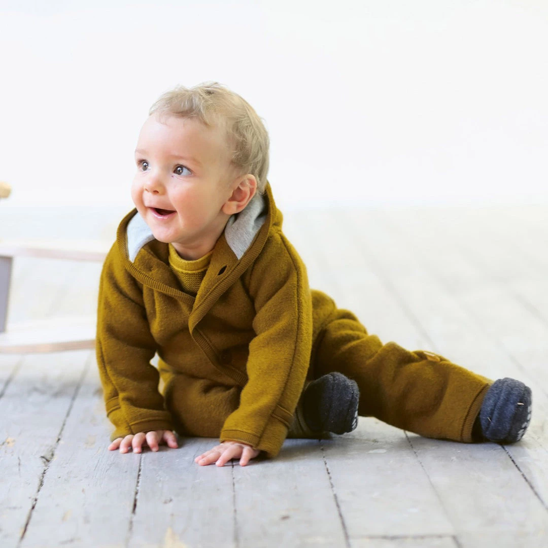 Disana’s boiled wool overall / snuggle-suit is perfect for babies and toddlers, keeping them warm from top to toe. Light and flexible, yet very warm, windproof and dirt resistant, this is a great suit. Use it from fall to spring. We feel these are true to size.