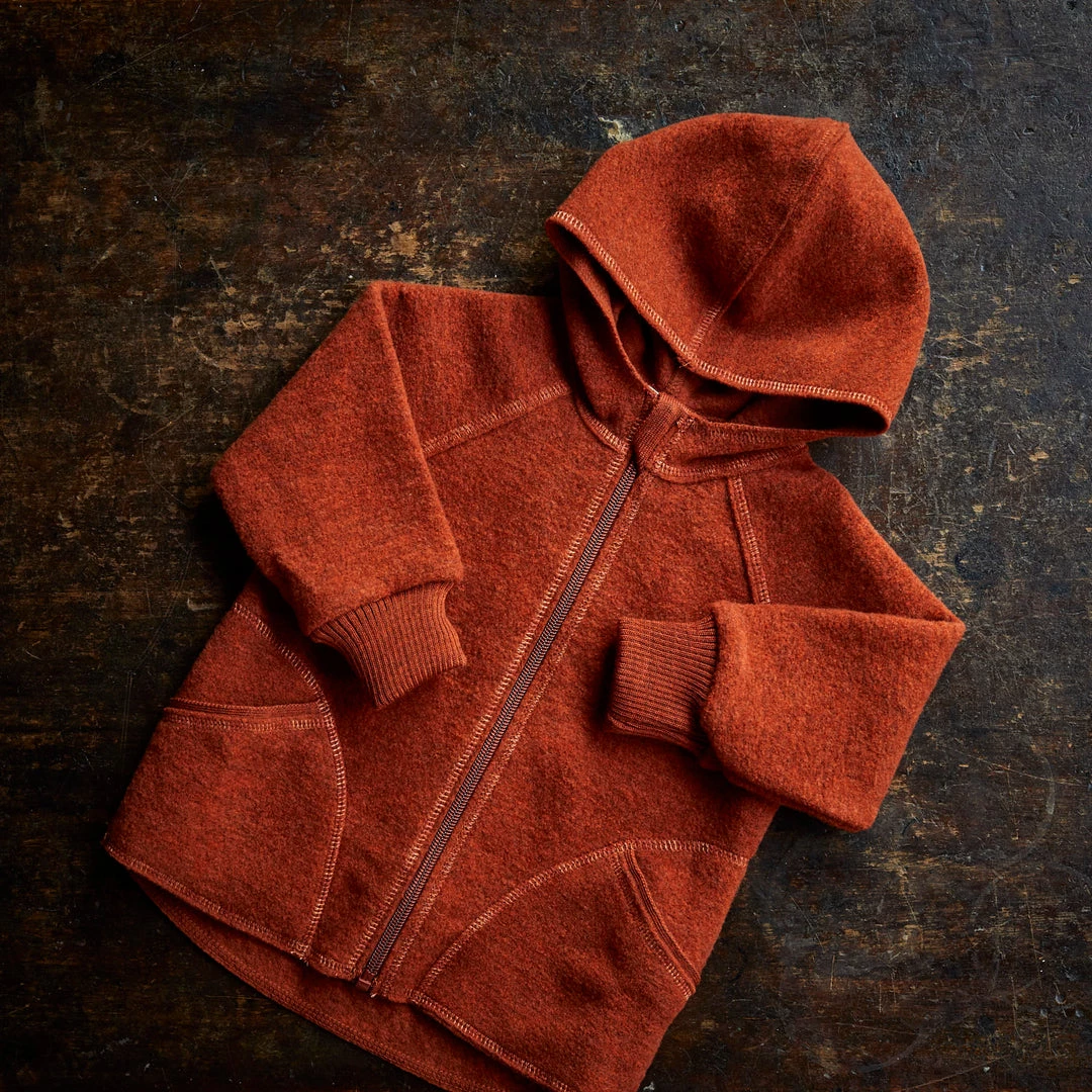 Lightweight boiled wool jacket with zip and hood. Features ribbed sleeve cuffs and stitching detail around the zipper and pockets. This jacket is great for layering, available in Magma and Lava.