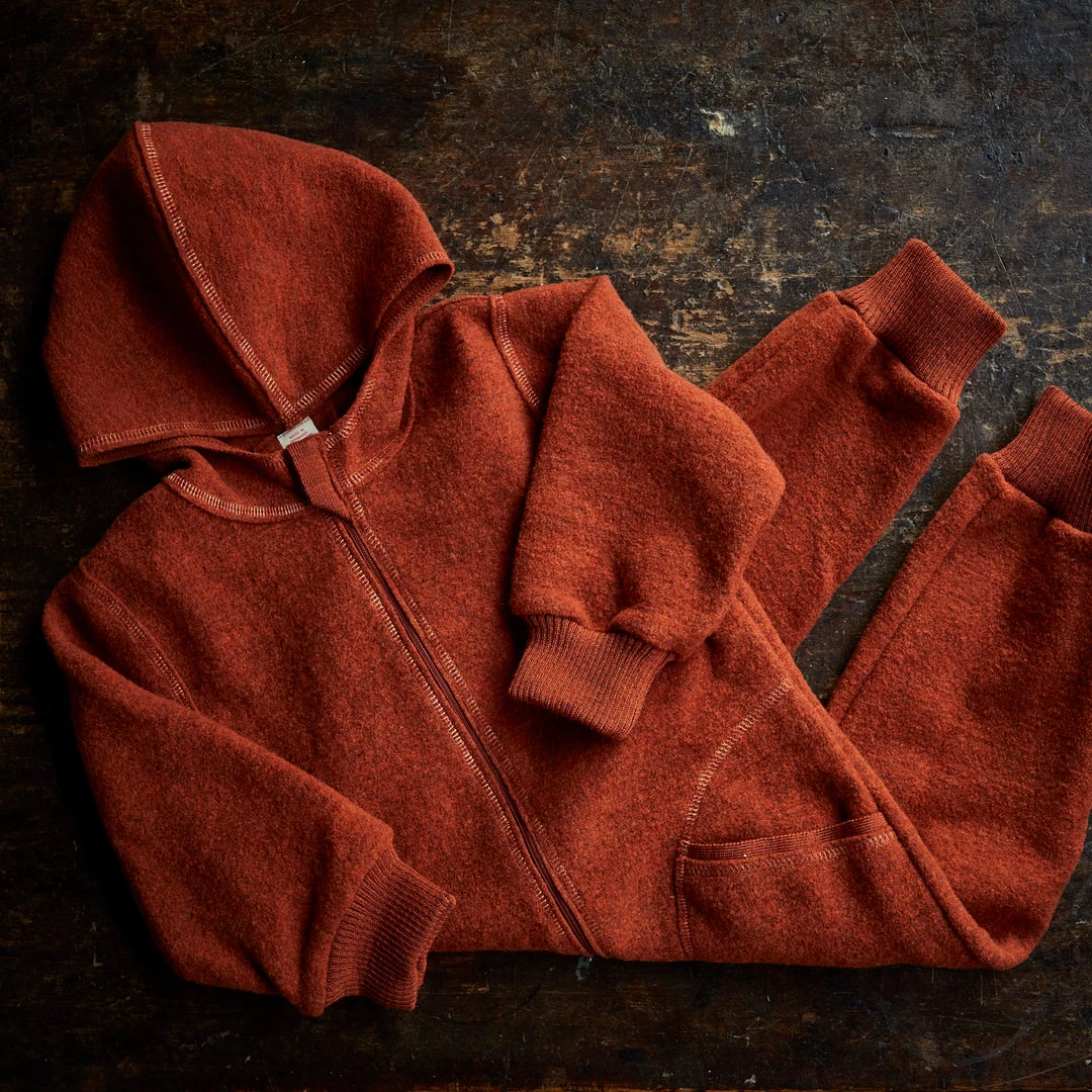 Lightweight boiled wool suit with zip and hood. Features ribbed sleeve cuffs and stitching detail around the zipper and pockets. This jacket is great for layering, available in Magma and Lava.