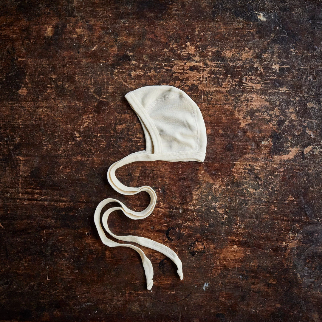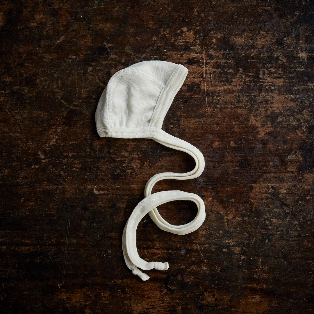 The perfect pure and natural bonnet for your newborn. Made from silk and merino wool. These bonnets are soft, breathable and will help your baby regulate their temperature. The long string ties can be crossed under the arms and tied round the back and down up with a bow on the chest. This is a great way to keep a bonnet on but without the worry of ties near the neck.