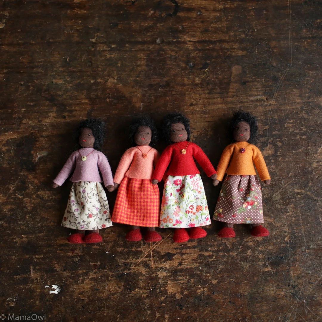 Flexible Dolls house dolls, perfect for playing with alongside all types of toys. Each doll is unique and is made using scraps of material from production waste. As each doll is different, the item you receive may not be reflected in the images here. Dolls are picked at random and we do not have images of all the different clothing colour options as these change with every delivery.