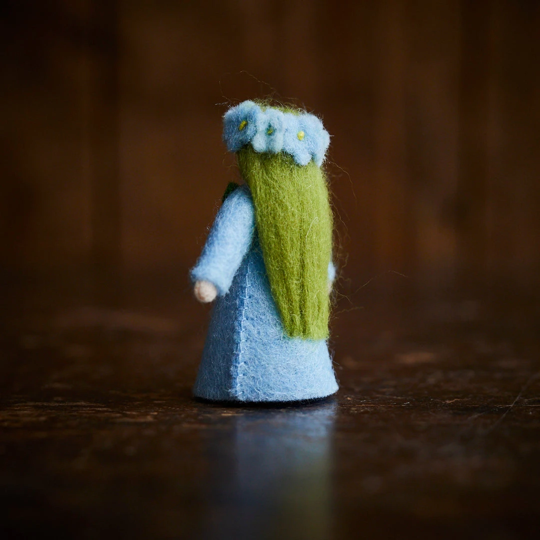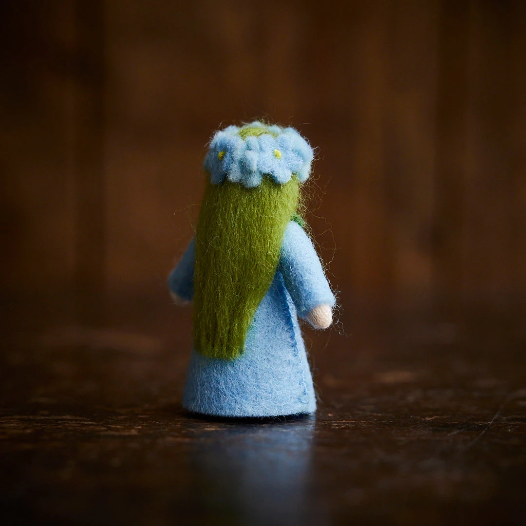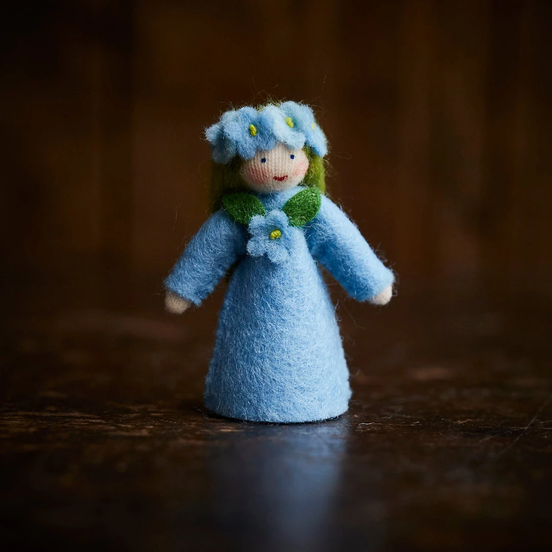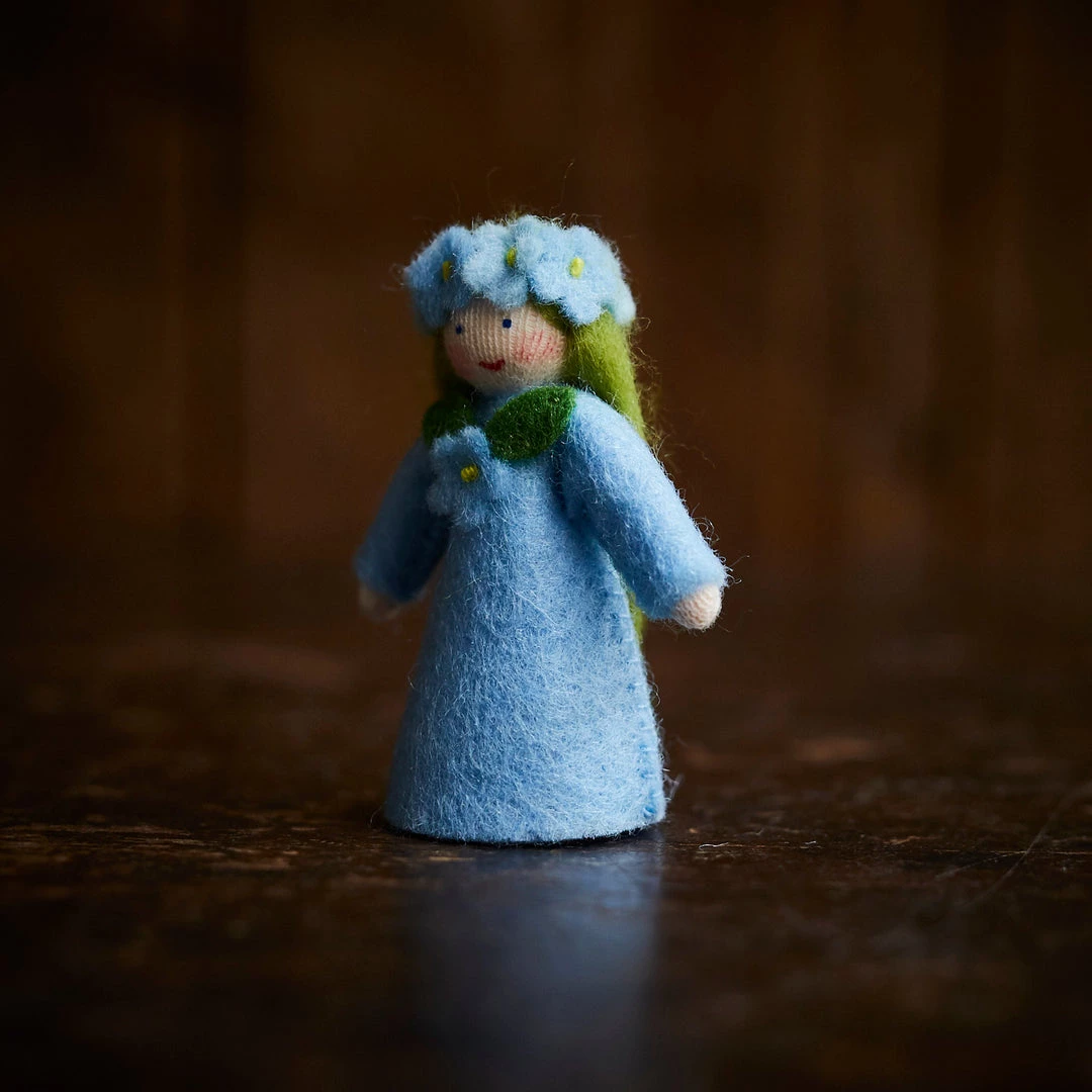Little handmade flower fairies, made of wool felt and crafted in Romania. Spring flower Forget Me Not.