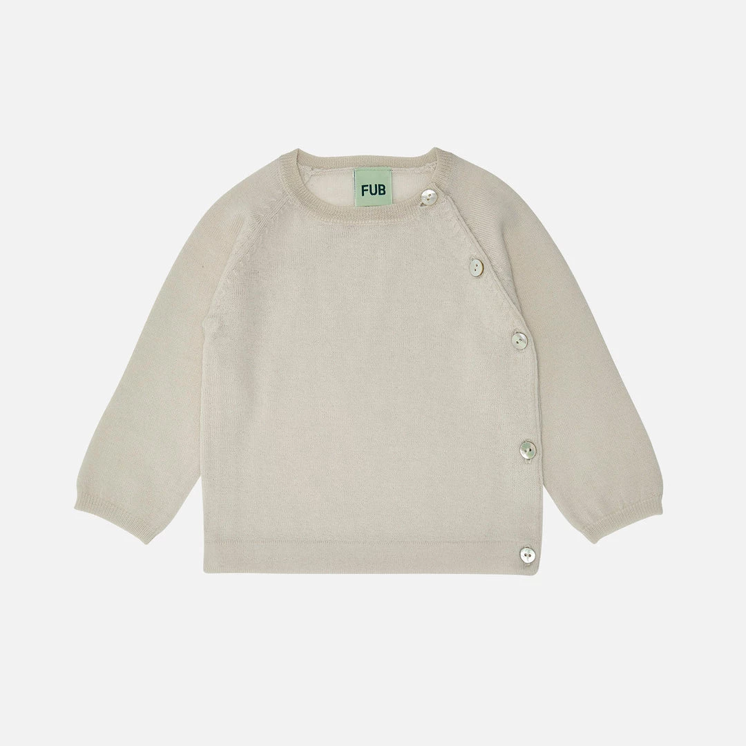 Baby basic cardigan in extra fine knit wool. The cardigan has a round neckline and is designed with a wrap-around effect, with button closure along the side made of pearl shell. The cardigan has a straight fit.