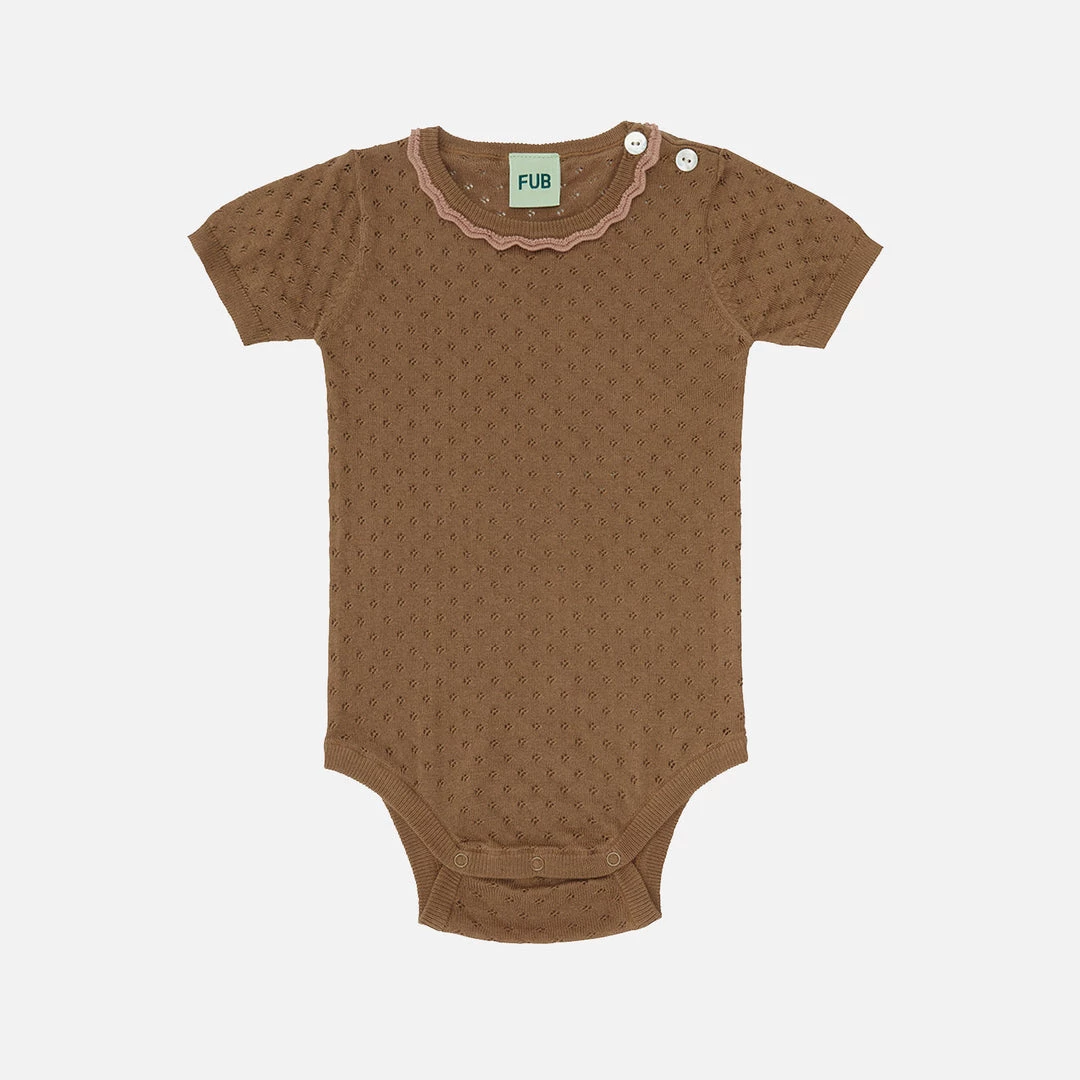 Body with practical button closure at shoulder with real pearl shell buttons and snap fasteners at the crotch. Knitted in a delicate pointelle pattern with knitted lace detail at neckline.