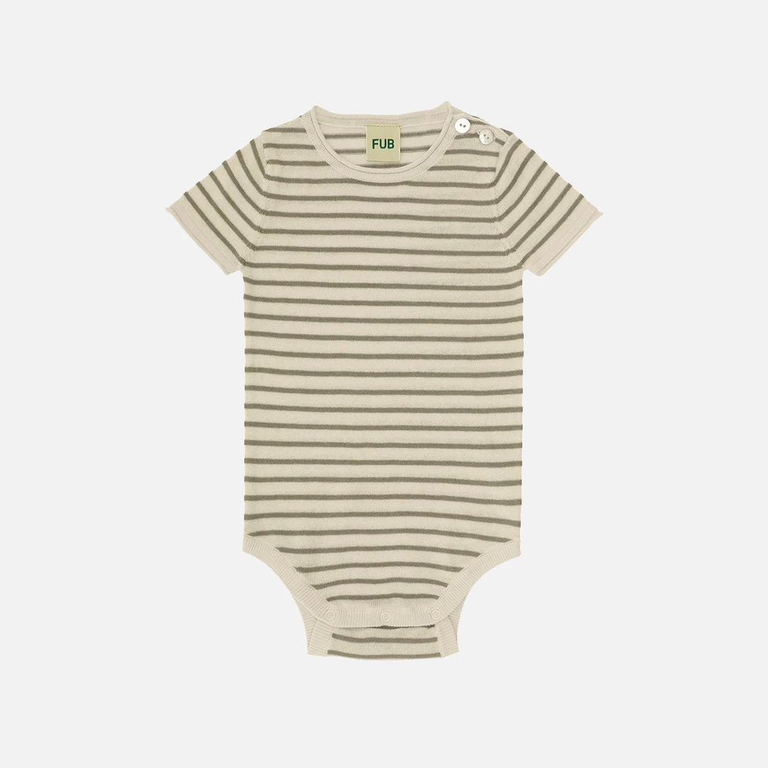 This striped baby body is a FUB classic. Knitted in a soft lightweight single jersey. Designed with short sleeves, a round neckline and clean folded hems. Features a practical button closure at shoulder with real pearl shell buttons and snap fasteners at the crotch. Knitted with narrow yarn-dyed stripes all over.