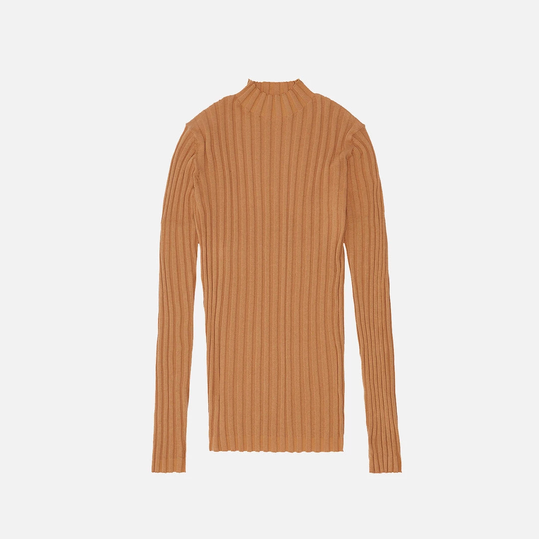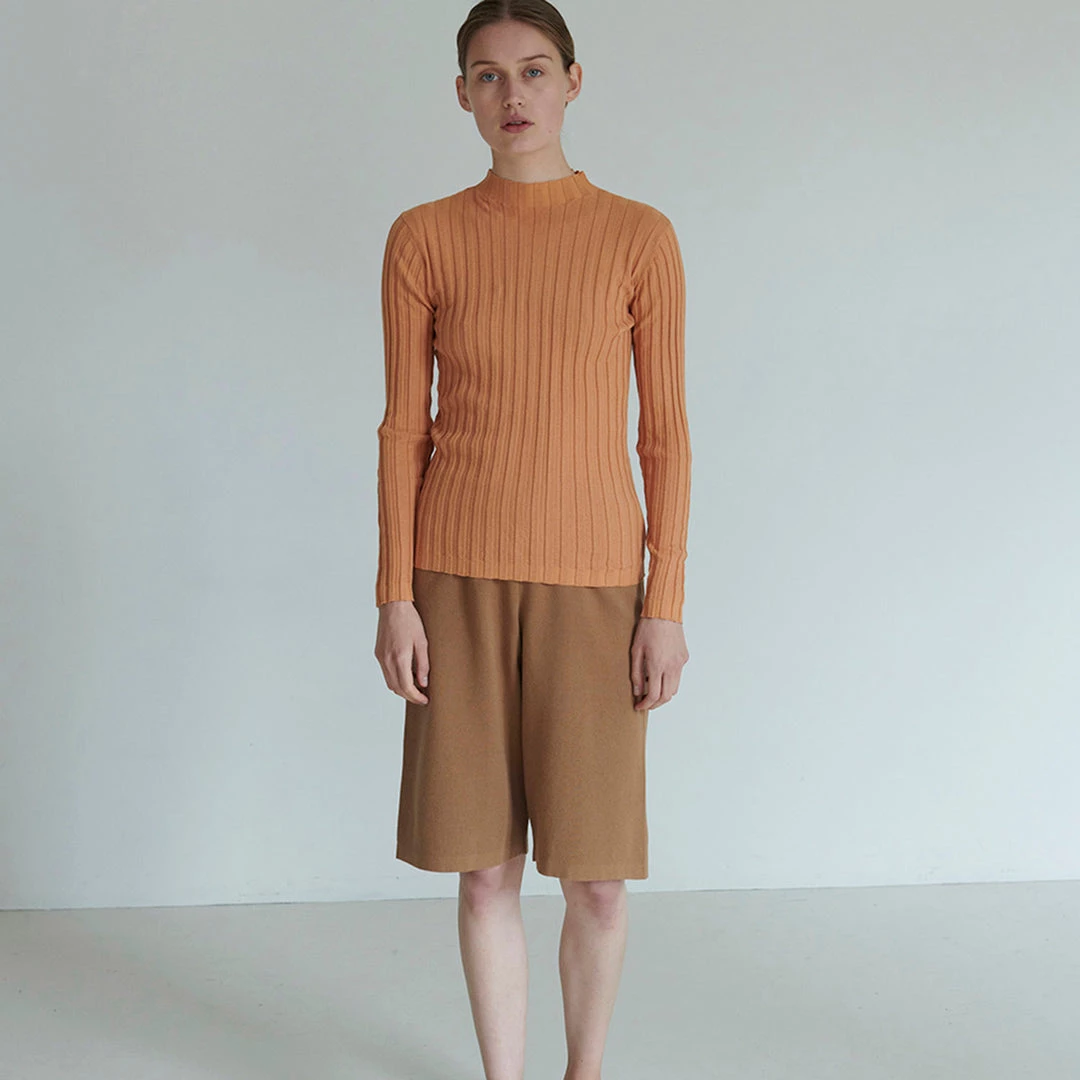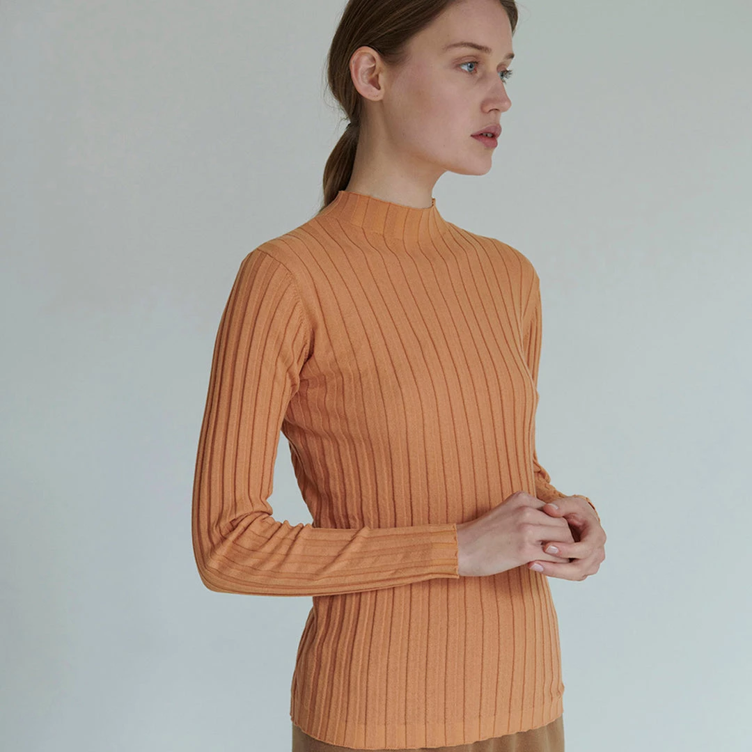 Long sleeve top with a straight slim fit. Knitted in extra fine rib. Features a high neckline and clean selvedge. Perfect weight for summer.