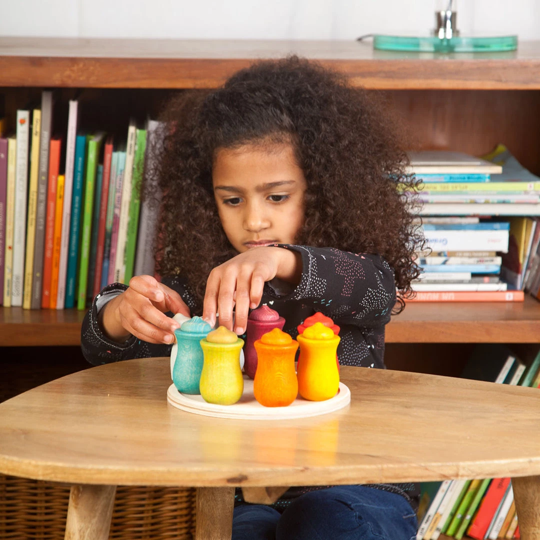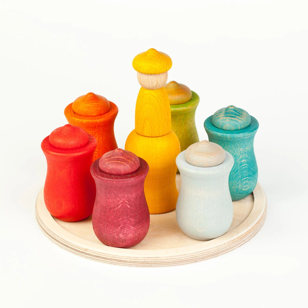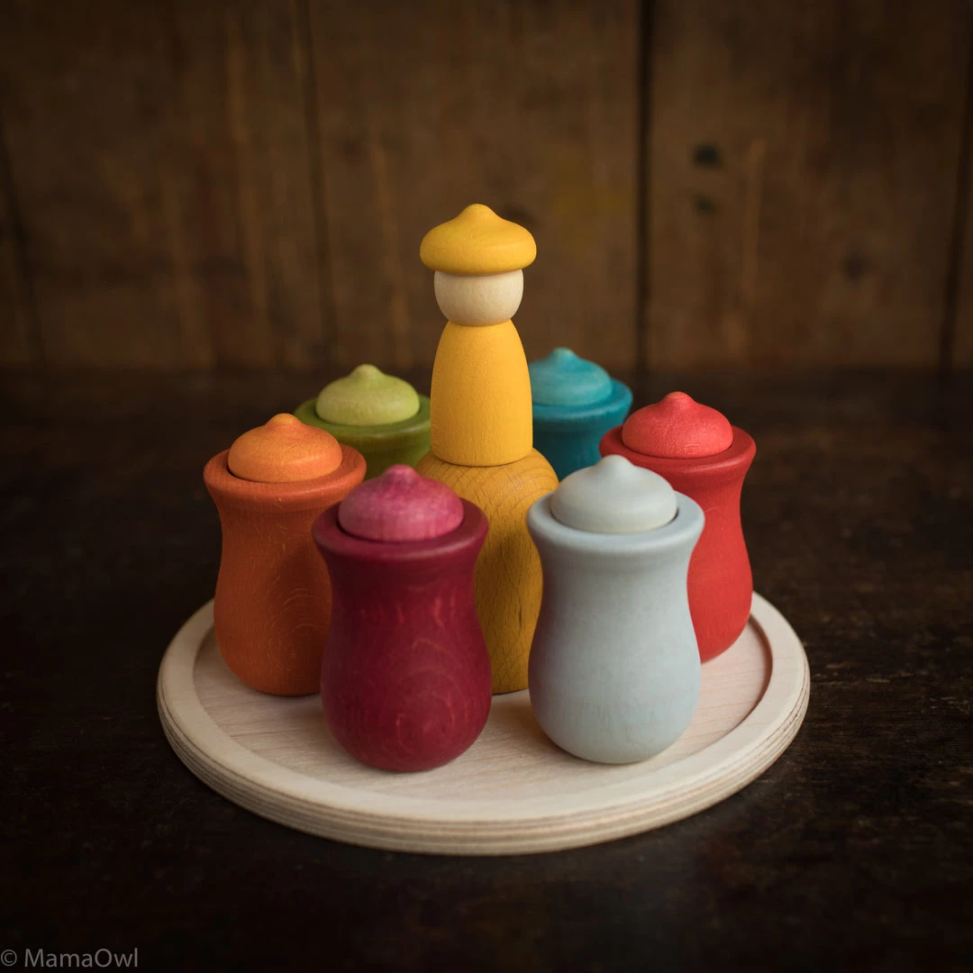 Contains 7 Nins®-acorns in 7 colors that are associated with each day of the week according to Waldorf pedagogy. 7 vessels and 1 round dish (18cm diameter) where the elements are contained.