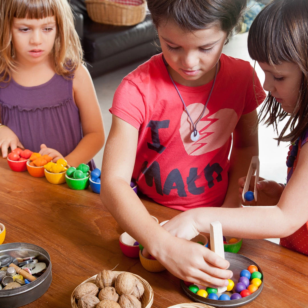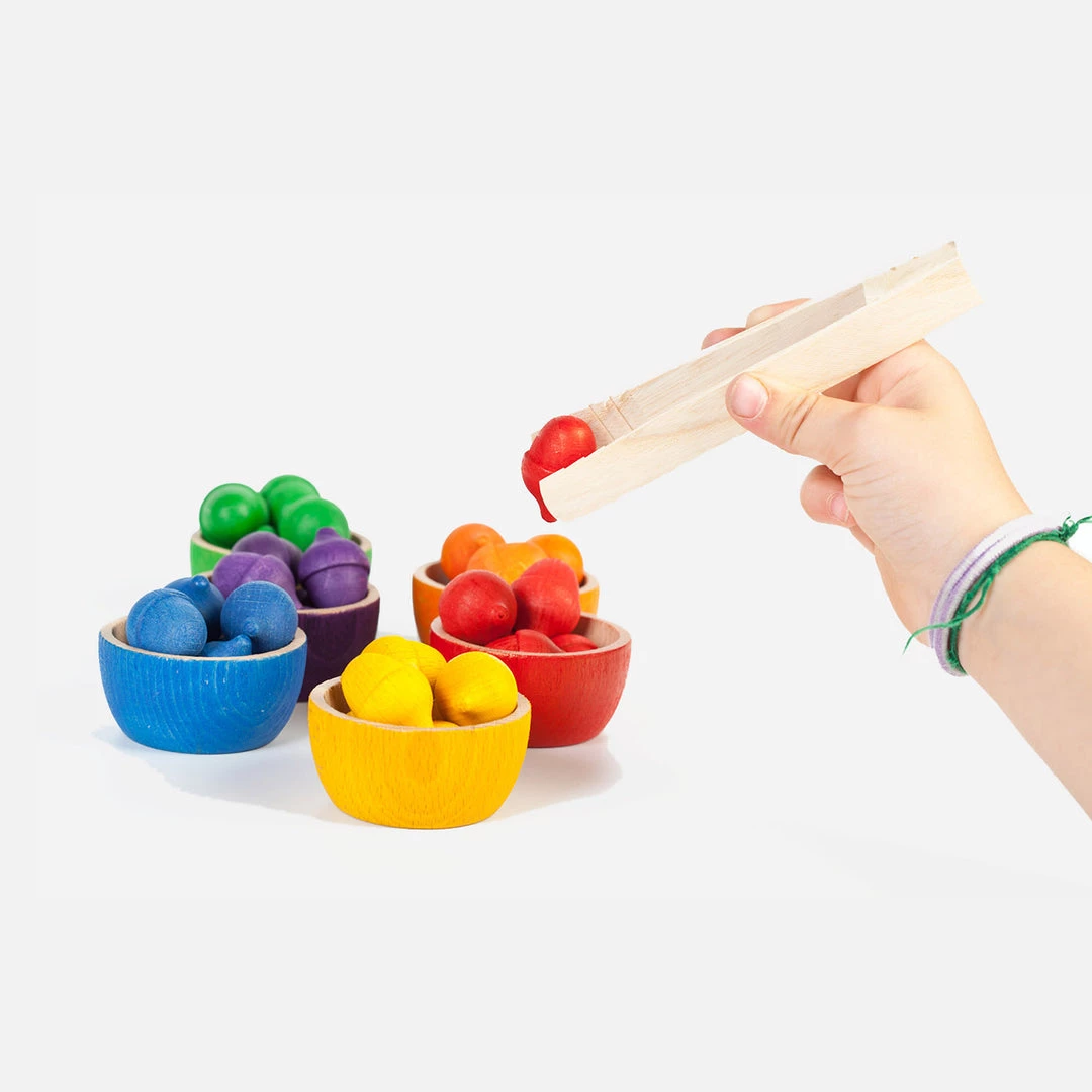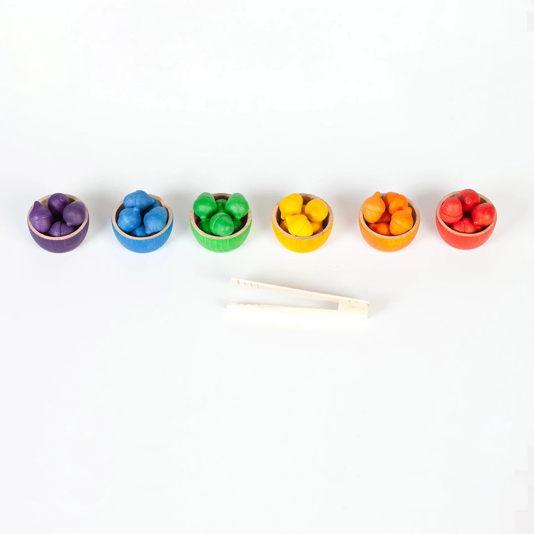 It contains Bowls with Acorns in the colours of the rainbow. Includes a cloth bag and a tong.