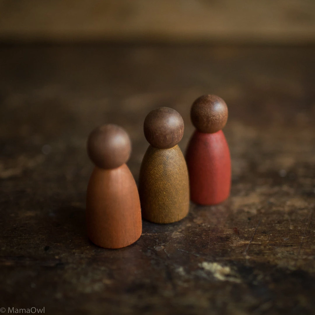 3 Nins in yellow, orange and red colours in a darker Wood.