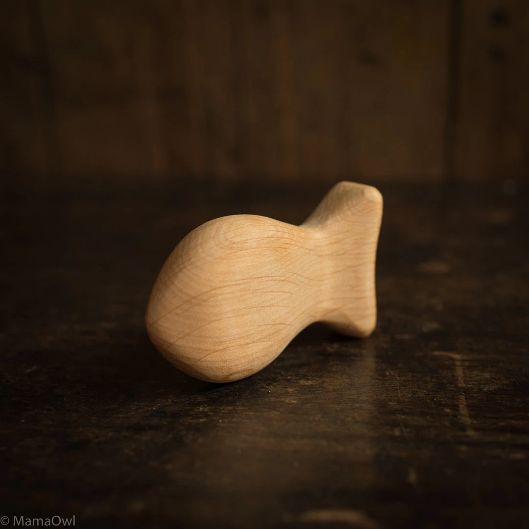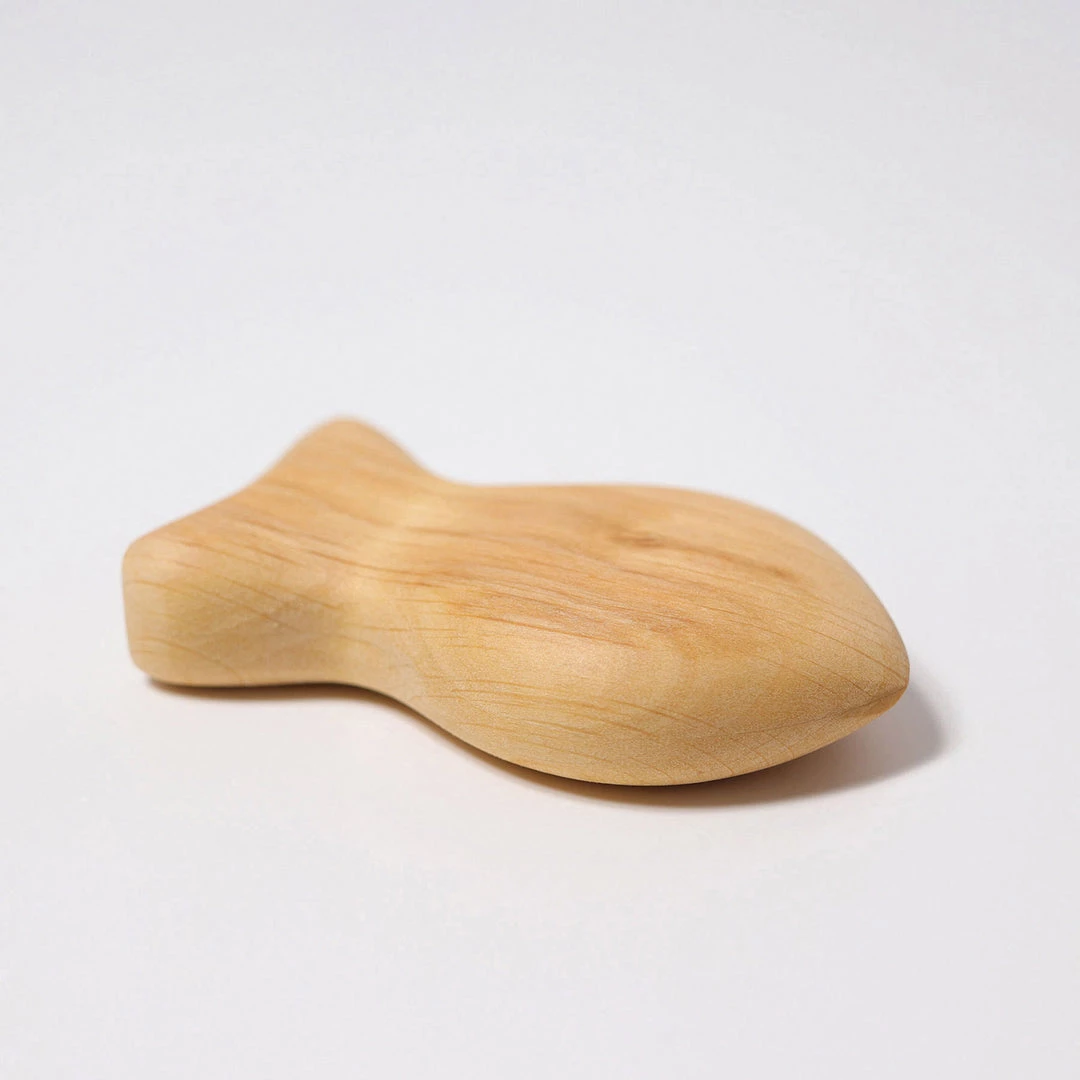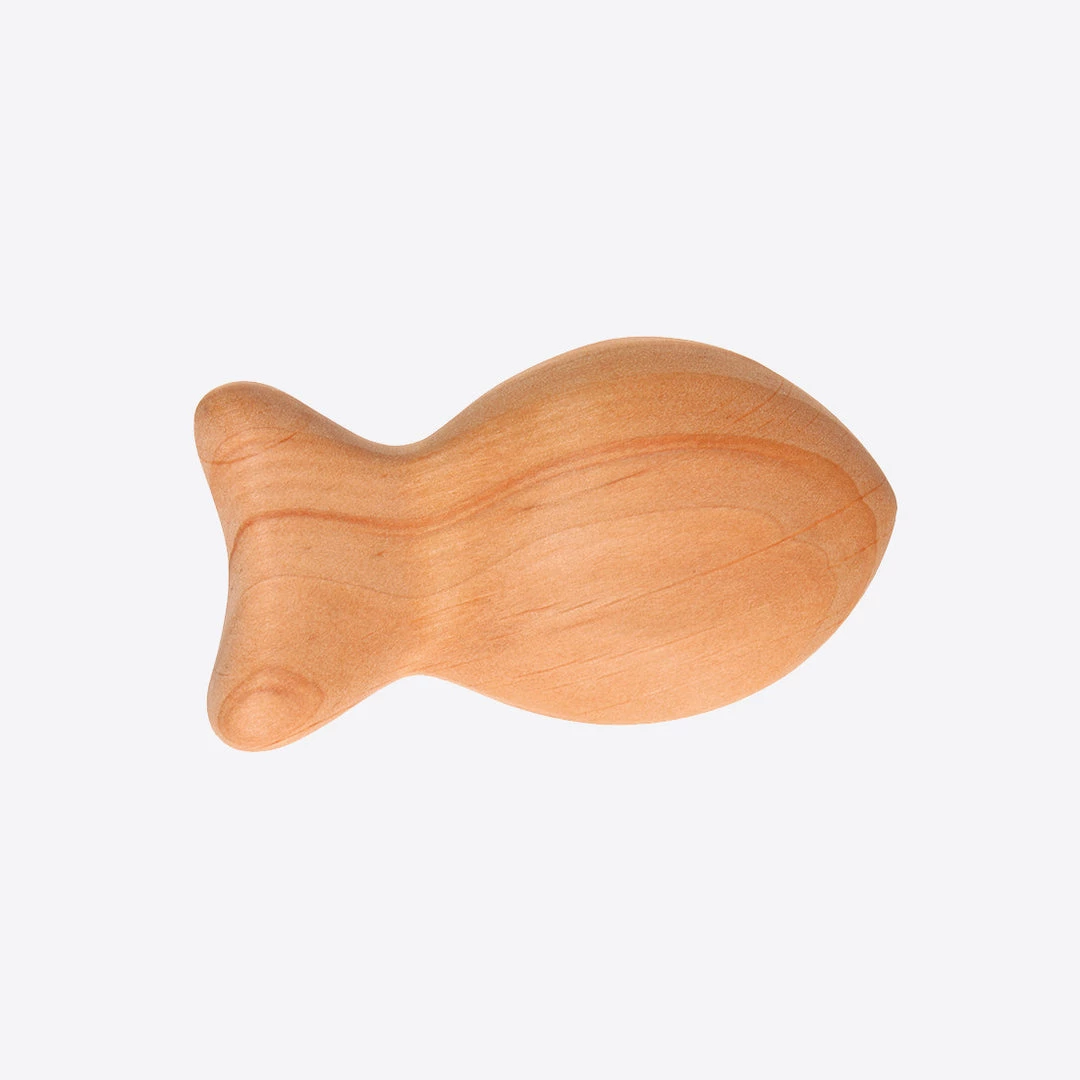 A Grimm’s classic. The rattle fish is filled with fine semi precious stones, which make a pleasant, gentle sound. The wood used from the alder tree is very special and gives unique structure to each of our rattles and grasping toys.