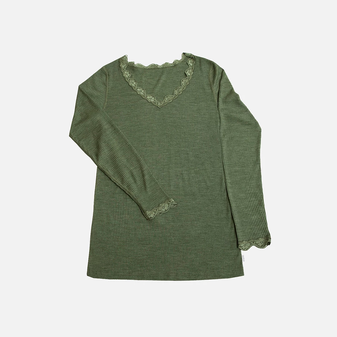 Thin and soft wool/silk rib long sleeve top. Features lace details at neck and end of sleeves. Can be worn as an outer top with a sleeveless top underneath or as a soft base layer under your clothes during winter. If it is bought to be worn as a base layer, We also stock matching hipsters in Jade and Black.