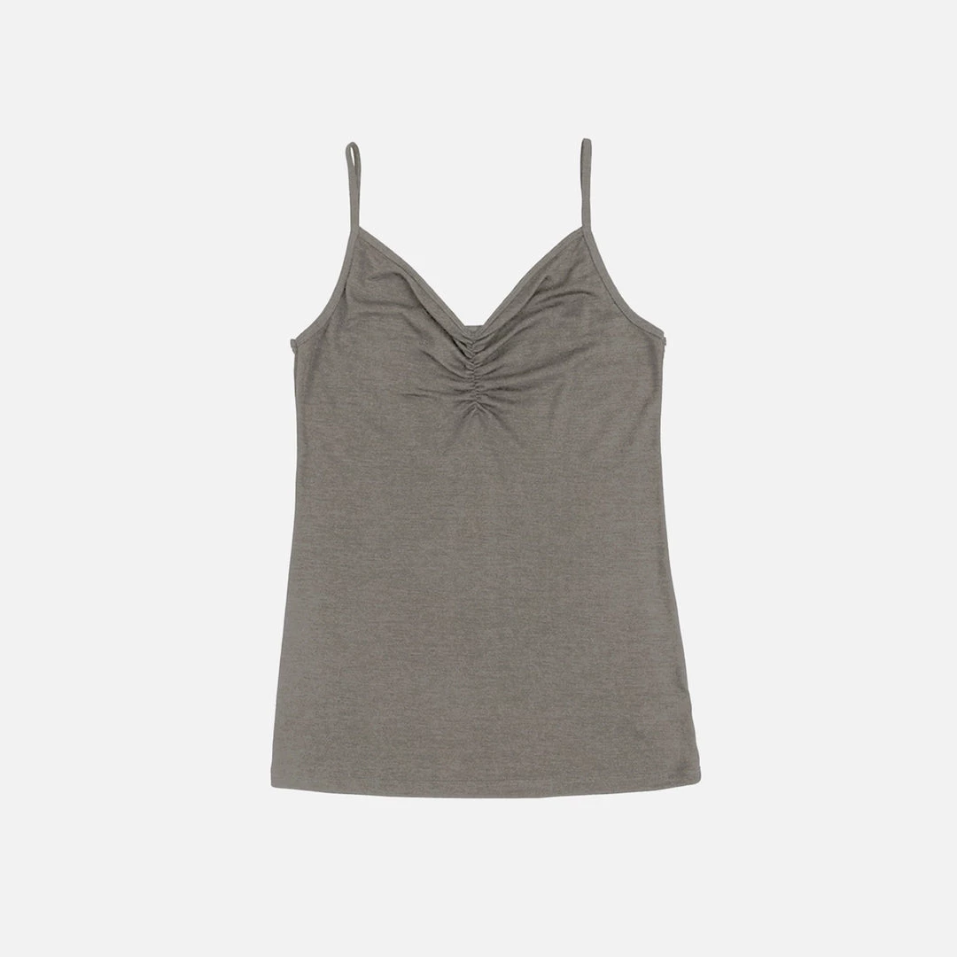 Fine weight, soft wool/silk strappy top. Features stitching at the mid chest for a flattering neckline. Can be worn as a top in the summer or as a soft base layer under your clothes during winter. We also stock matching hipsters in Sesame and Black.