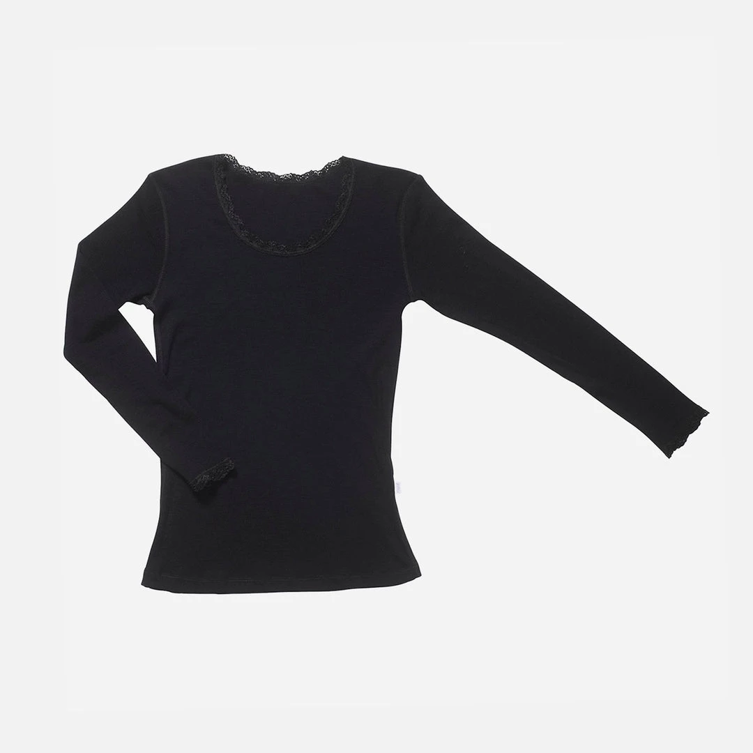 Thin and soft merino wool long sleeve top with lace details. Can be worn as an outer top with a sleeveless top underneath or as a soft base layer under your clothes during winter. If it is bought to be worn as a base layer, we also stock matching leggings in Black.