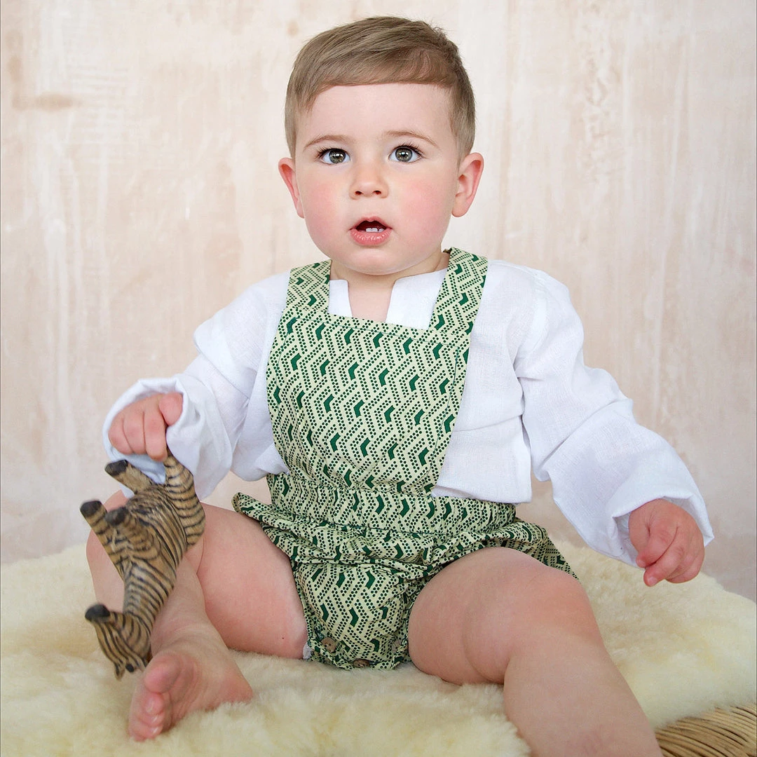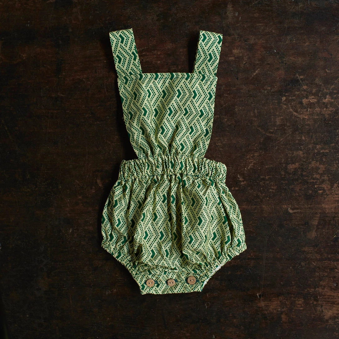 The Anwuli romper is a really sweet baby style. Made to fit newborn up to 2yrs. The classic bloomer style shorts have a a bib front with adjustable cross over straps that fasten at the back with coconut buttons.