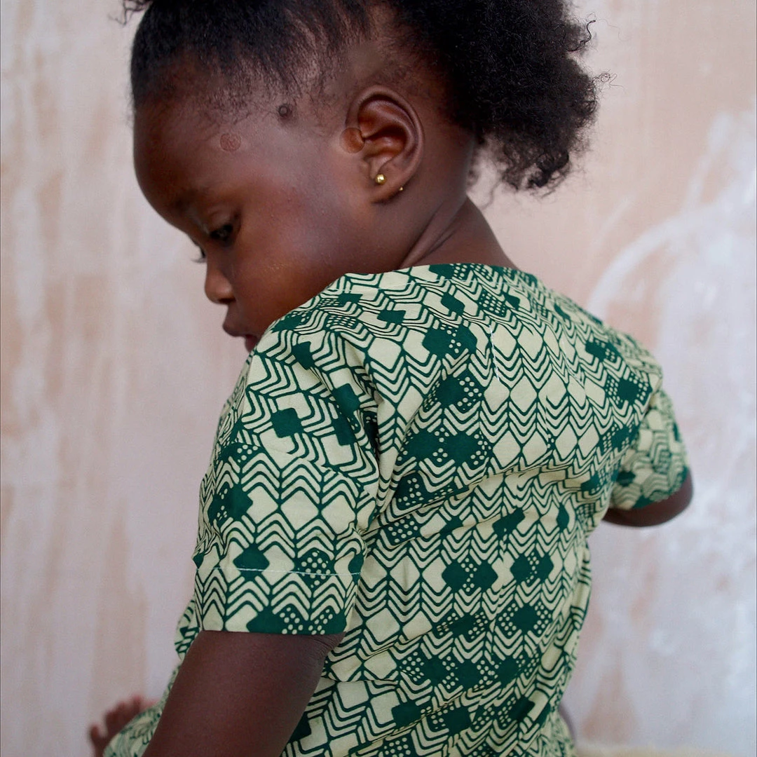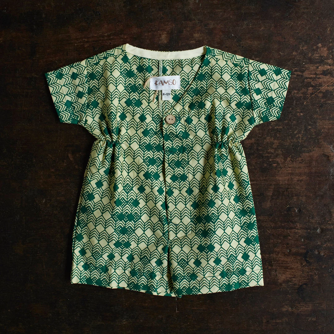 The Fola playsuit is a sweet v-neck style outfit with hidden fastening of coconut buttons down the centre front panel. Perfect for summer and everyday play.