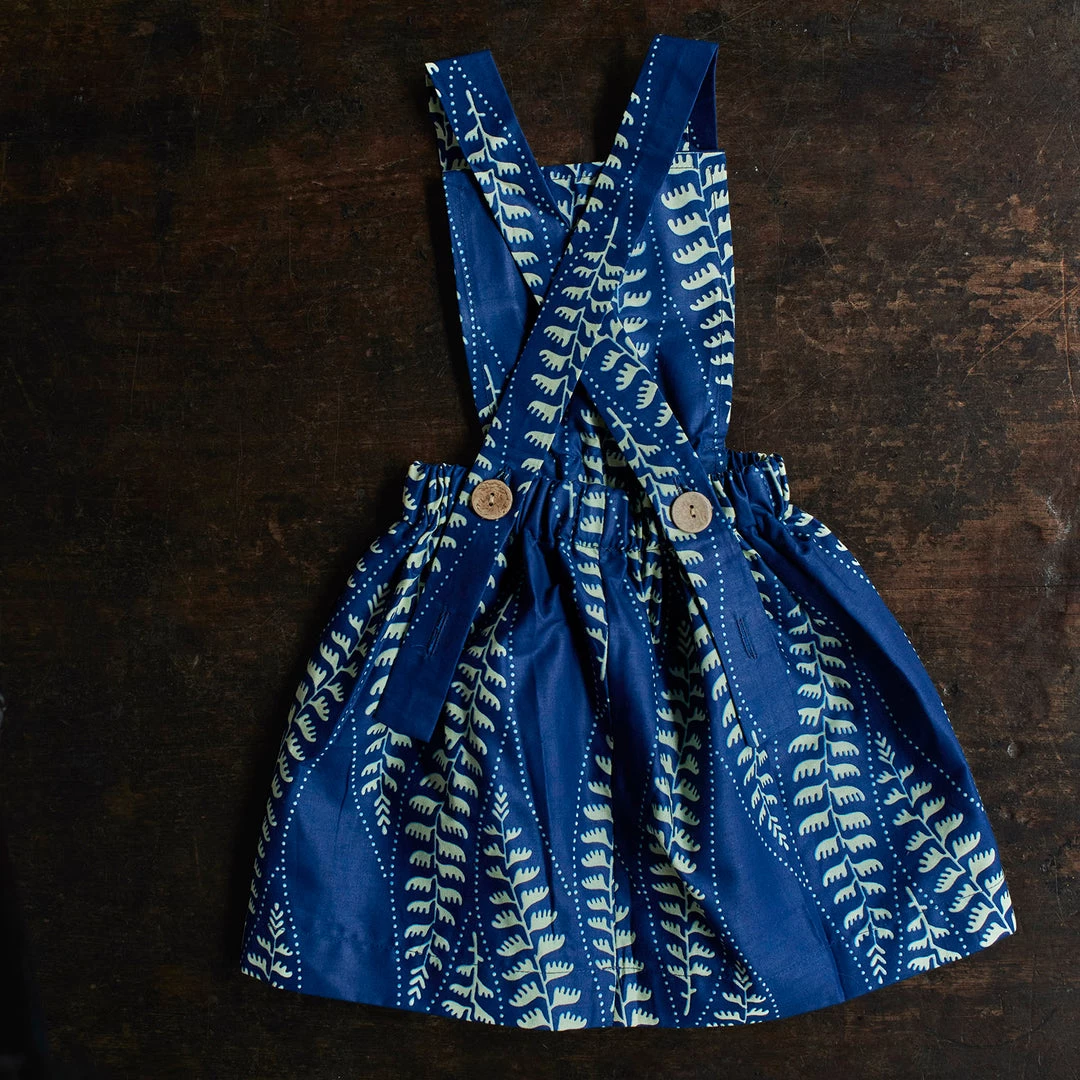 The Ndidi apron dress is a sweet style. Made with a bib front and adjustable cross over straps that fasten at the back with coconut buttons.
