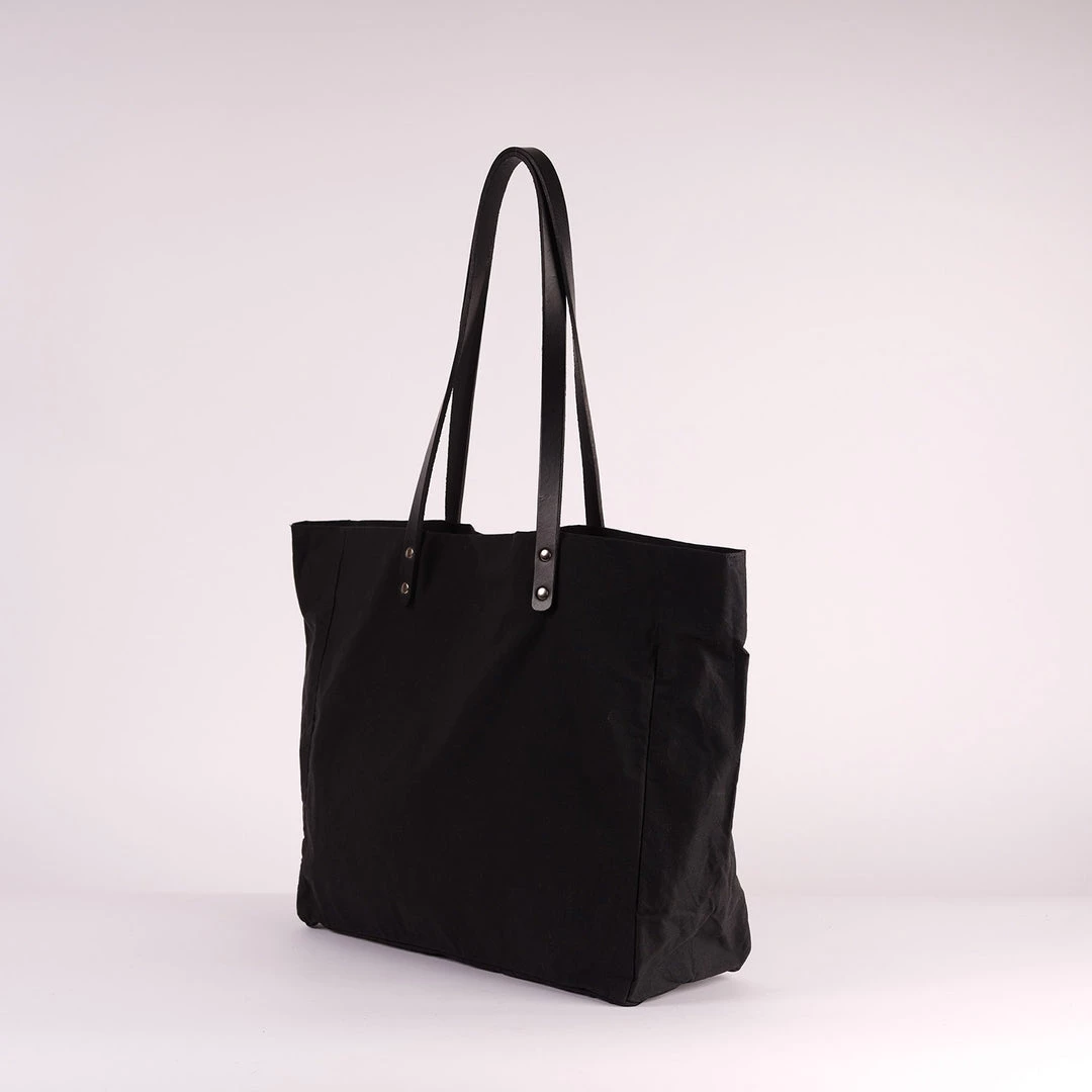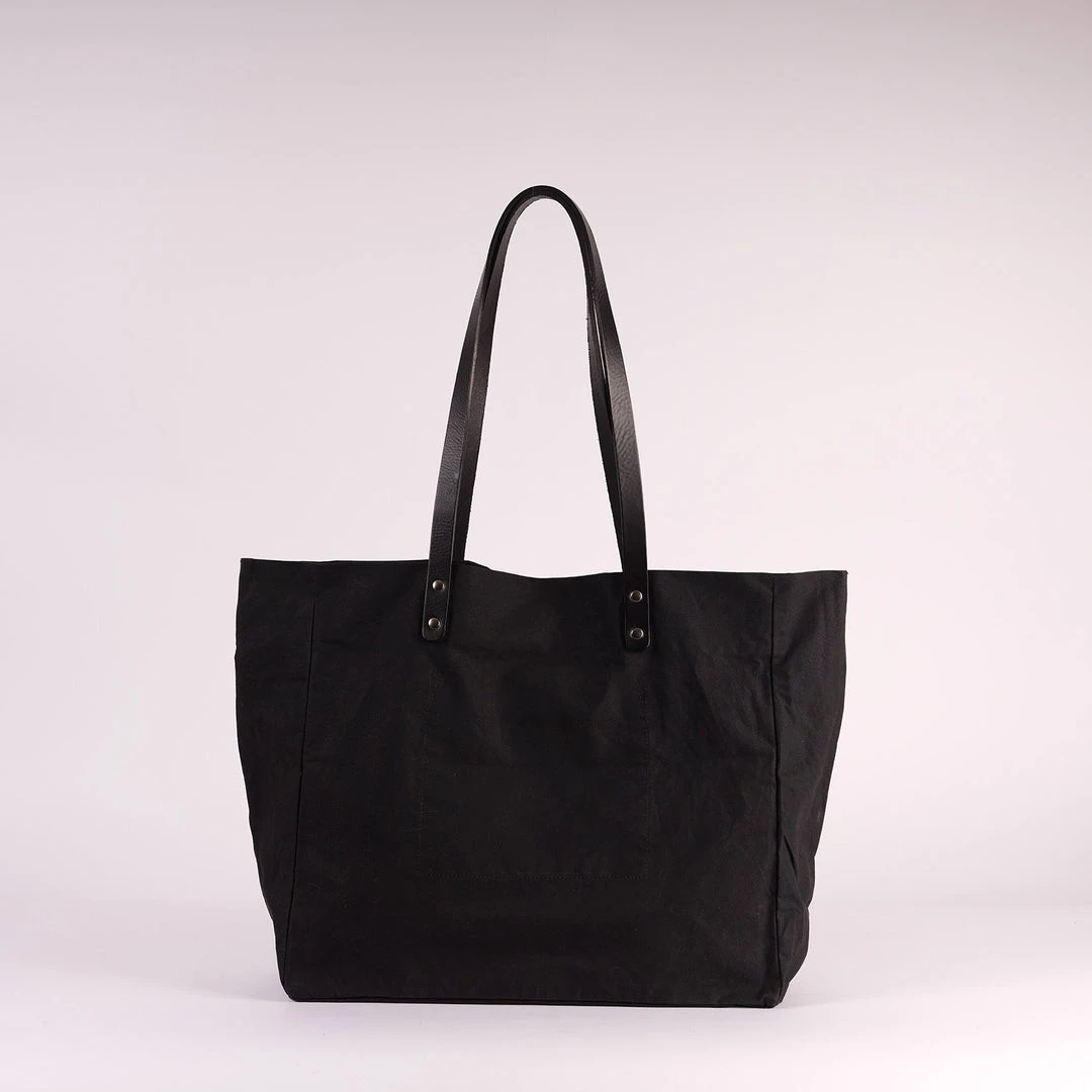A lightweight but strong tote, featuring sturdy vegetable tanned bridle handles, which are hand edge painted. The bag can be folded in and clipped at the sides to make a smaller and more triangular shape, or used open for full effect. Made from water resistant British waxed cotton with a slightly antique look finish which will age beautifully with wear.