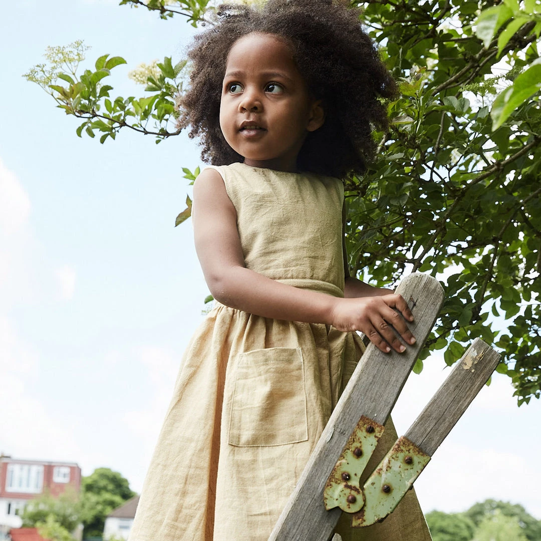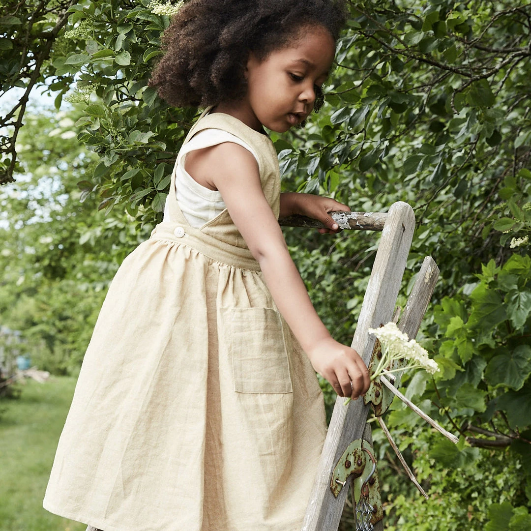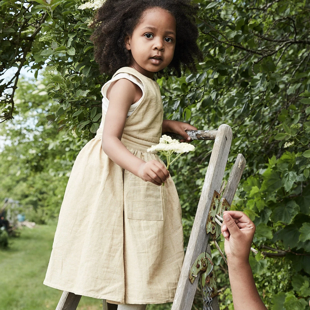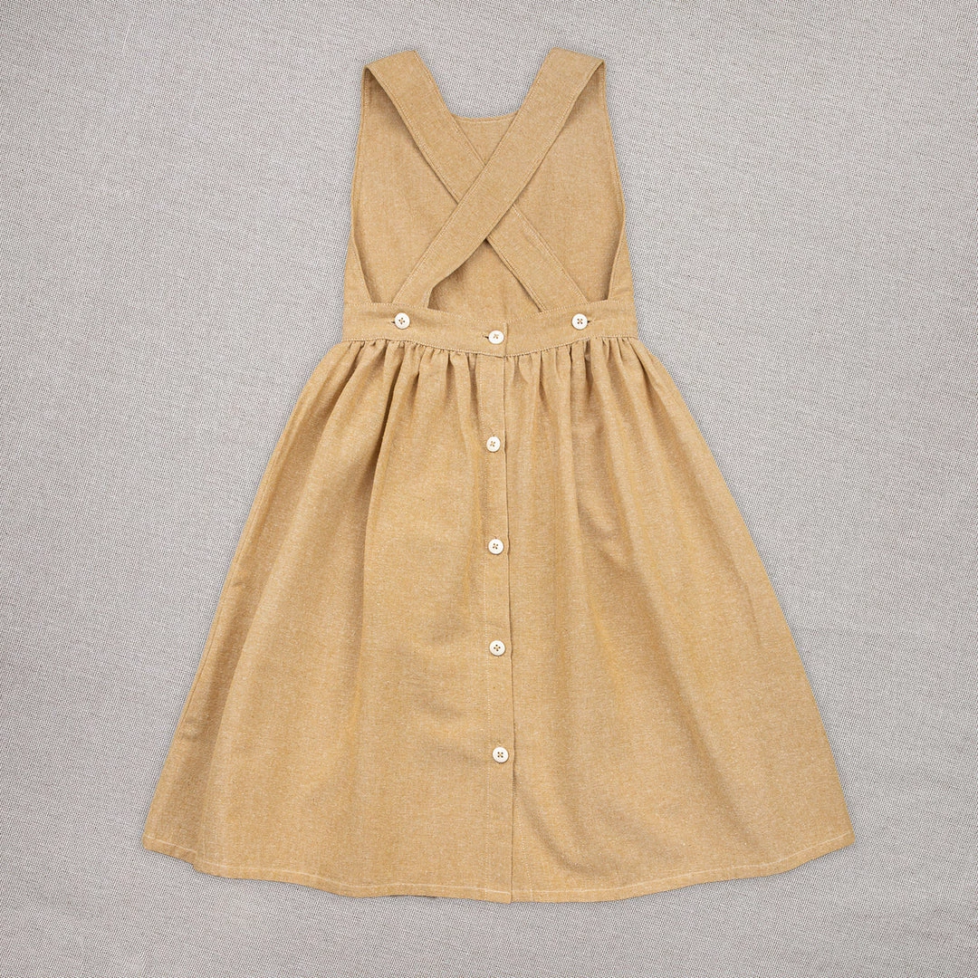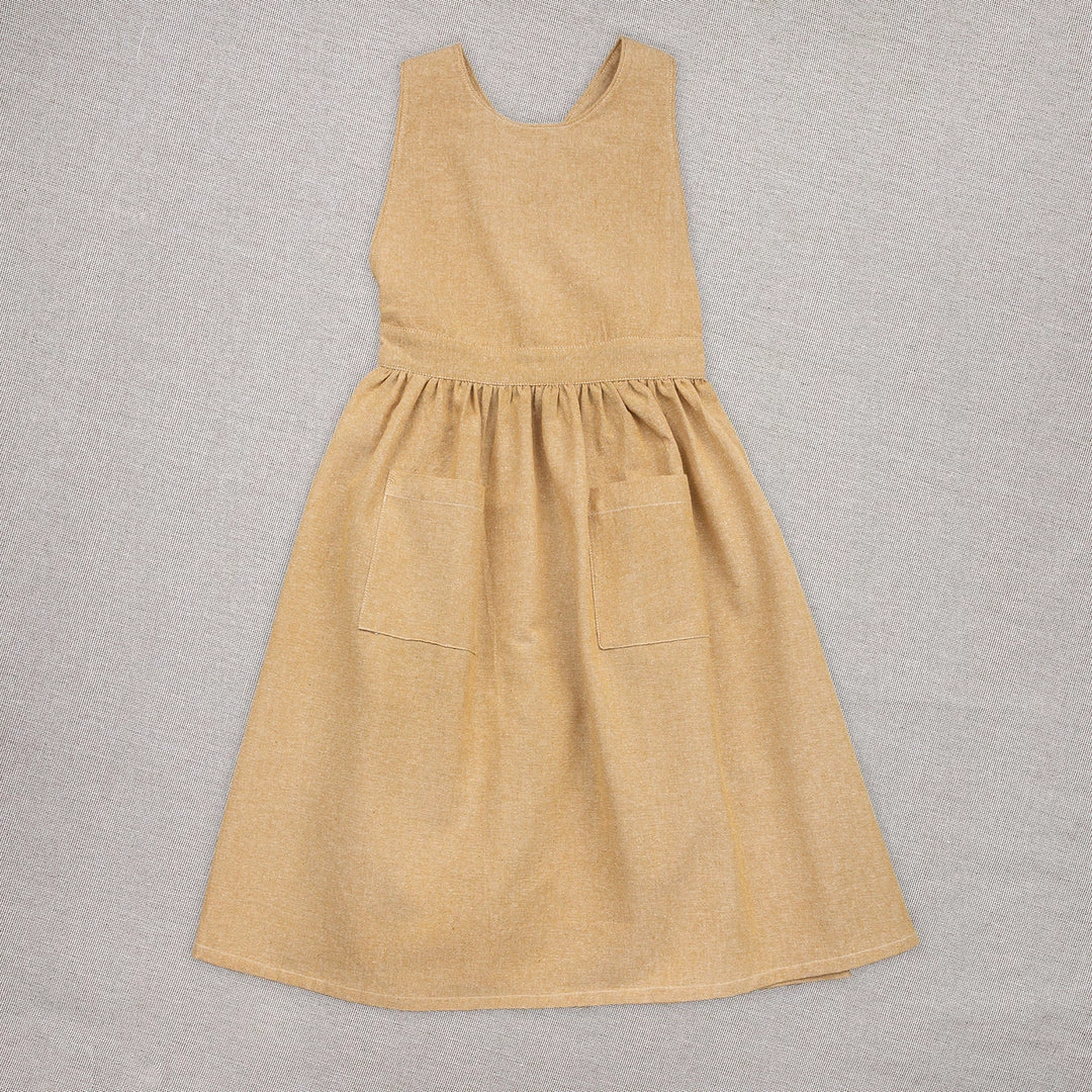 Apron style dress, open back with crossover straps, back elastic and gathered skirt with side pockets. This dress is are made from hand woven fabric.