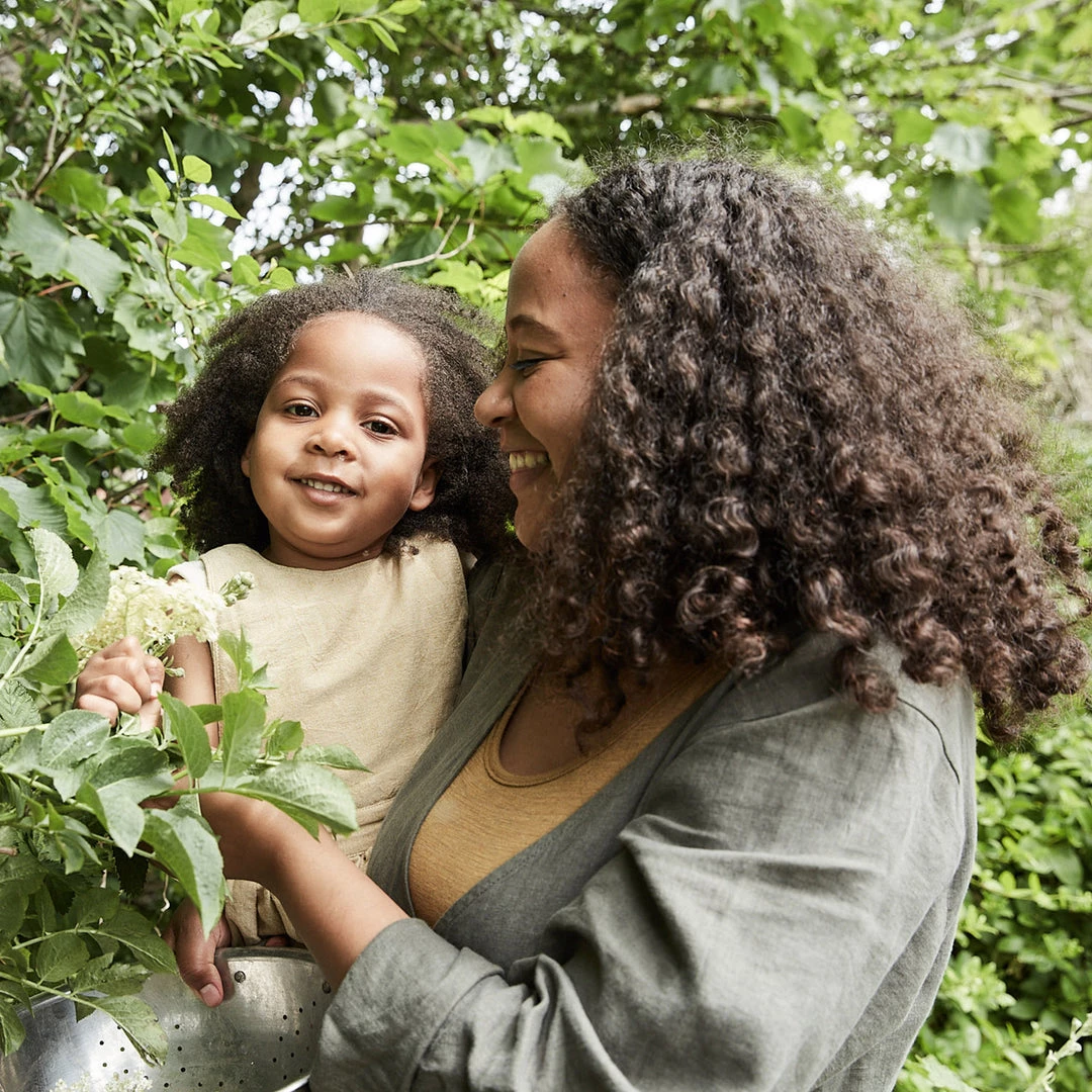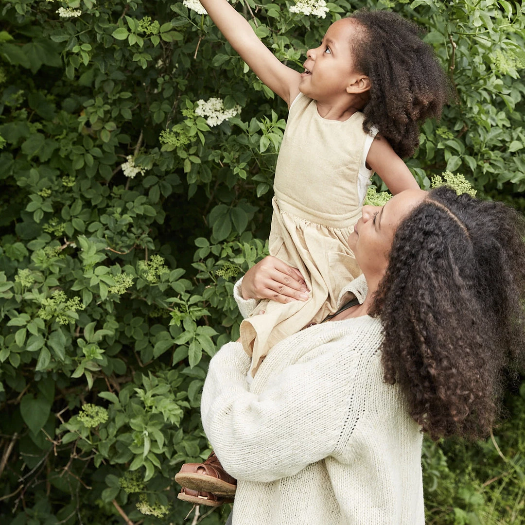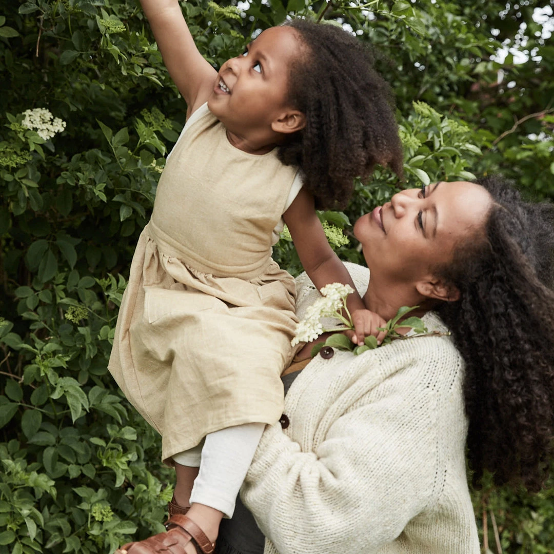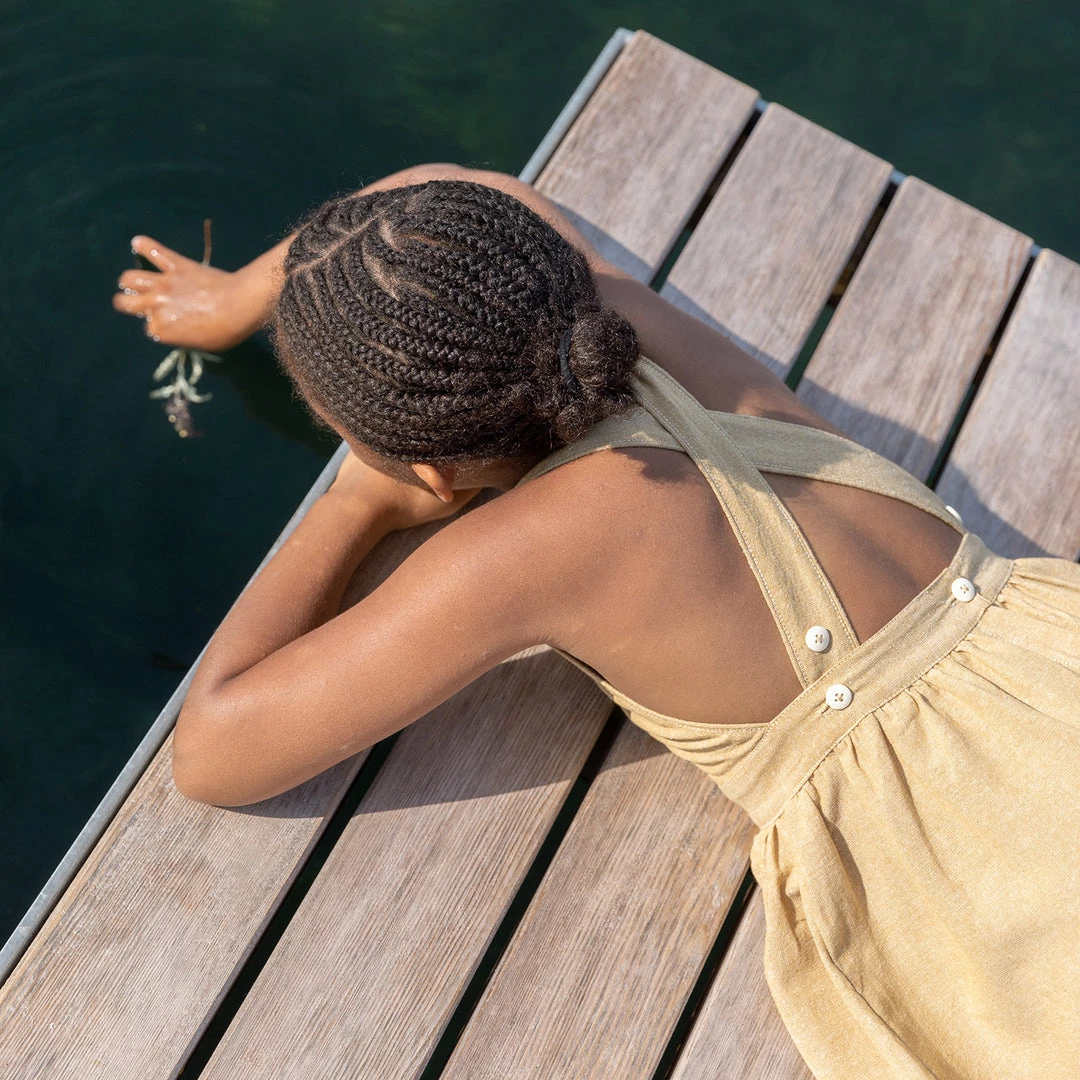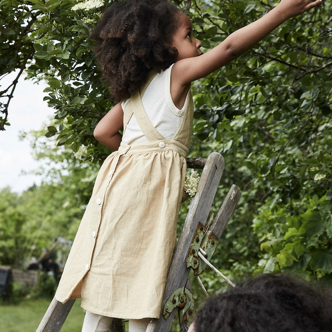 Apron style dress, open back with crossover straps, back elastic and gathered skirt with side pockets. This dress is are made from hand woven fabric.