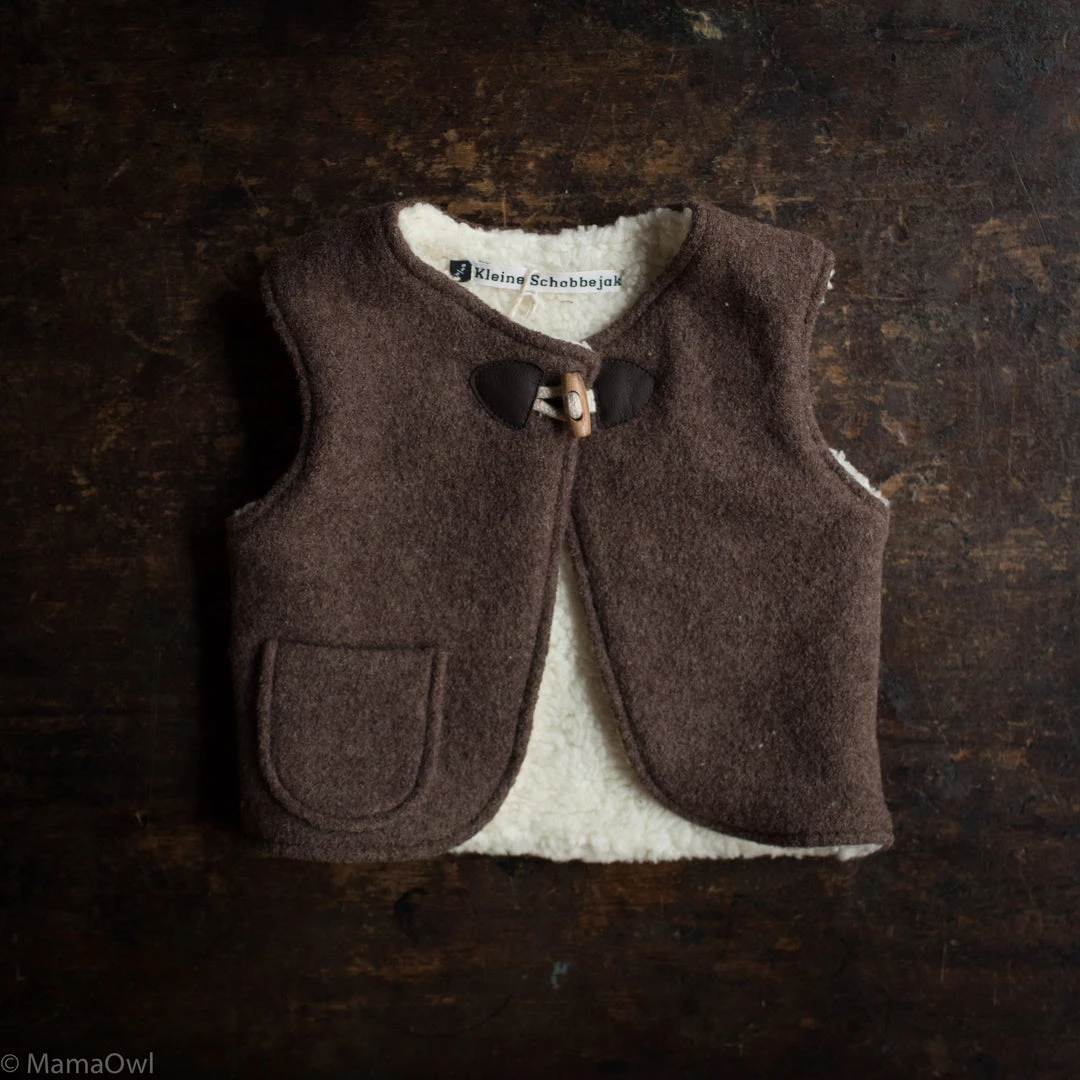 We are excited to introduce the Wool Winter Vest into our gorgeous Kleine Schobbejak range this season. Featuring in a sleeveless vest design with a wooden button closure on the chest and a singular pocket on the right hand side. This is a beautiful vest to style over base layers and with the Pixie Hat. This is a perfect alternative for little ones who refuse the thick heavy jackets whilst still keeping them warm all winter long.