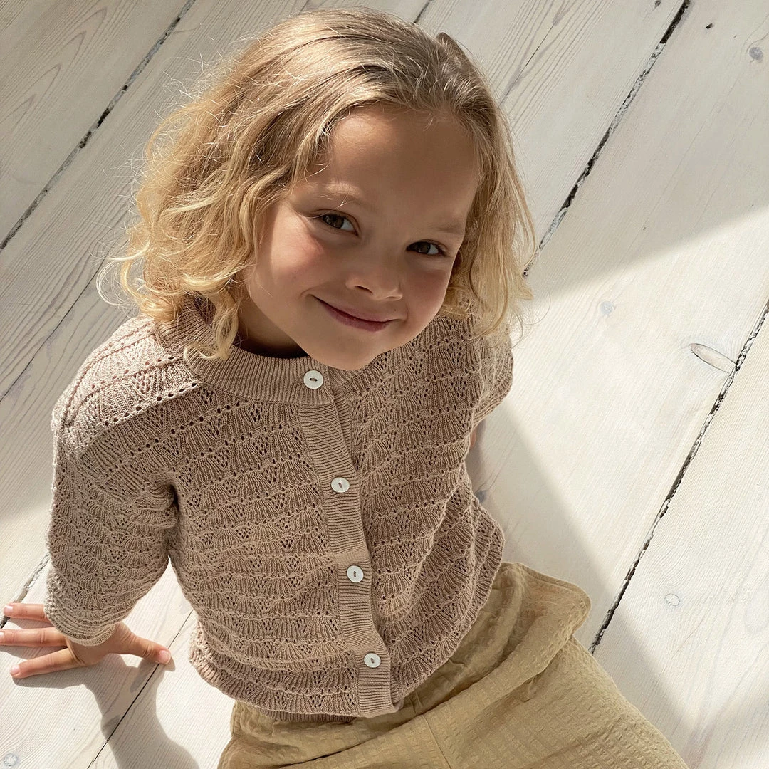 The Iris knitted cardigan features a beautiful knitted texture. It is a simple design and you can style this cardigan with almost anything. It is made from a lightweight cotton making it perfect for warm summer evenings.