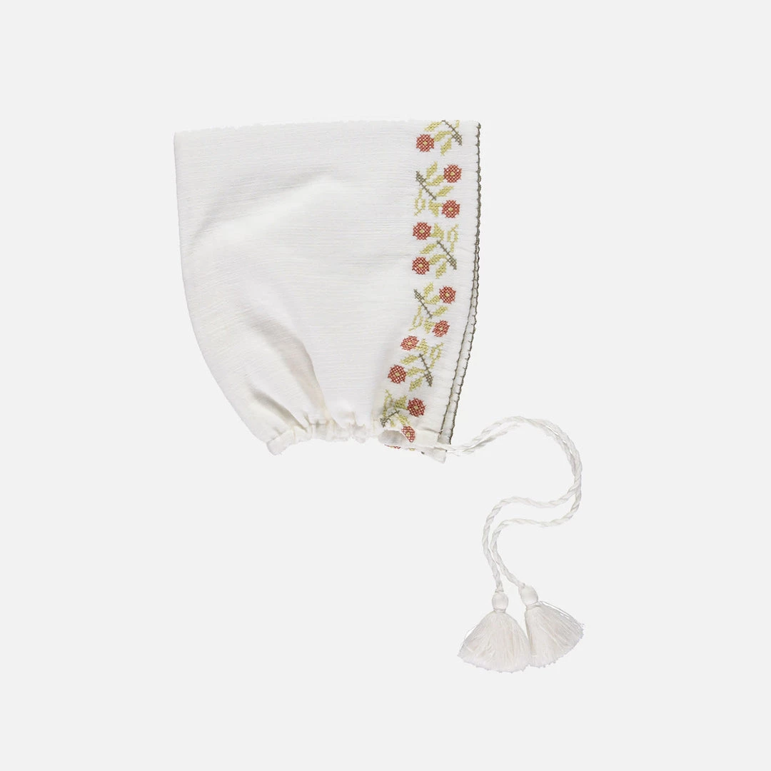 One of Liilu’s signature styles with a charming pointed pixie shape and useful string ties. Features the beautiful seasonal Folk Embroidery. Woven in a lightweight organic cotton.