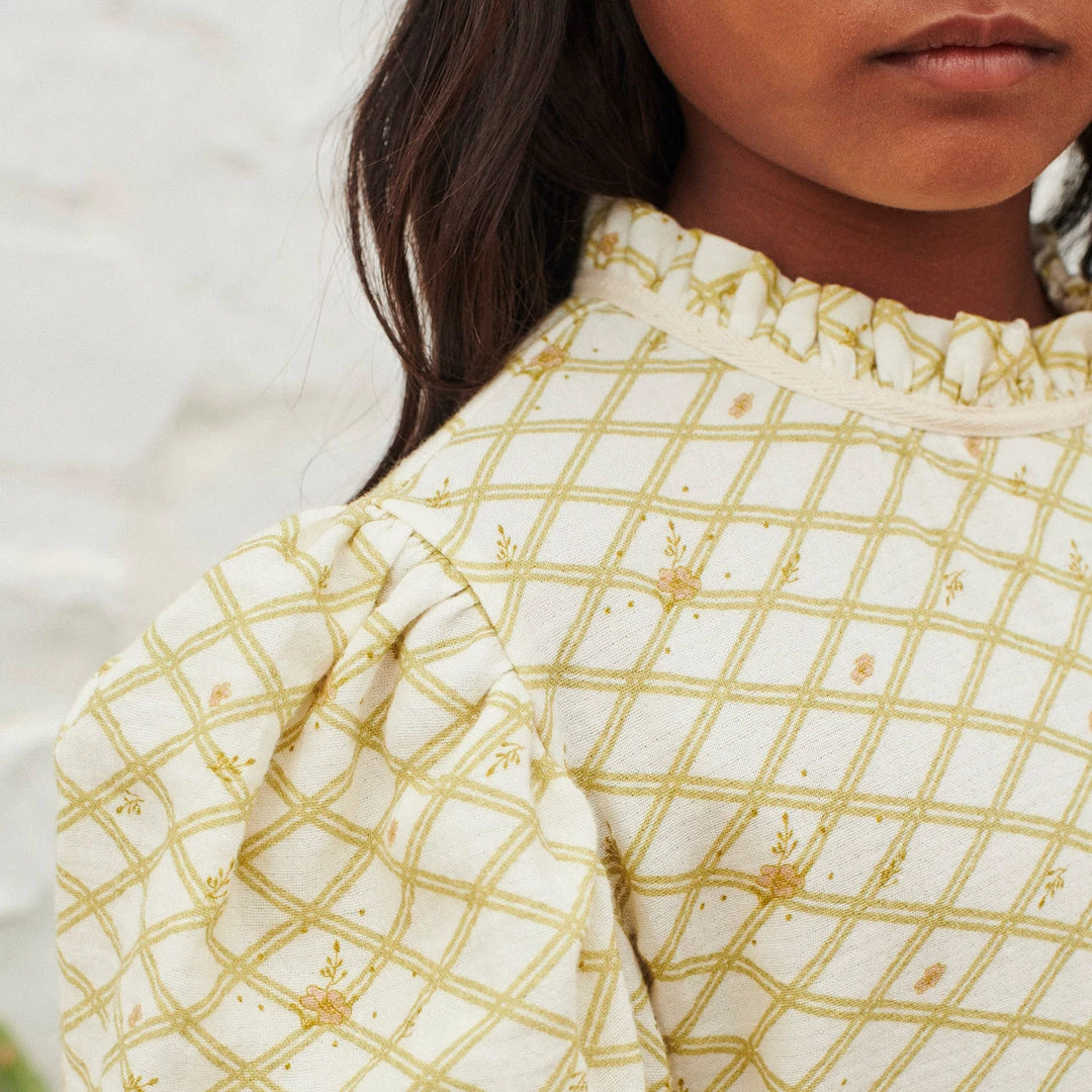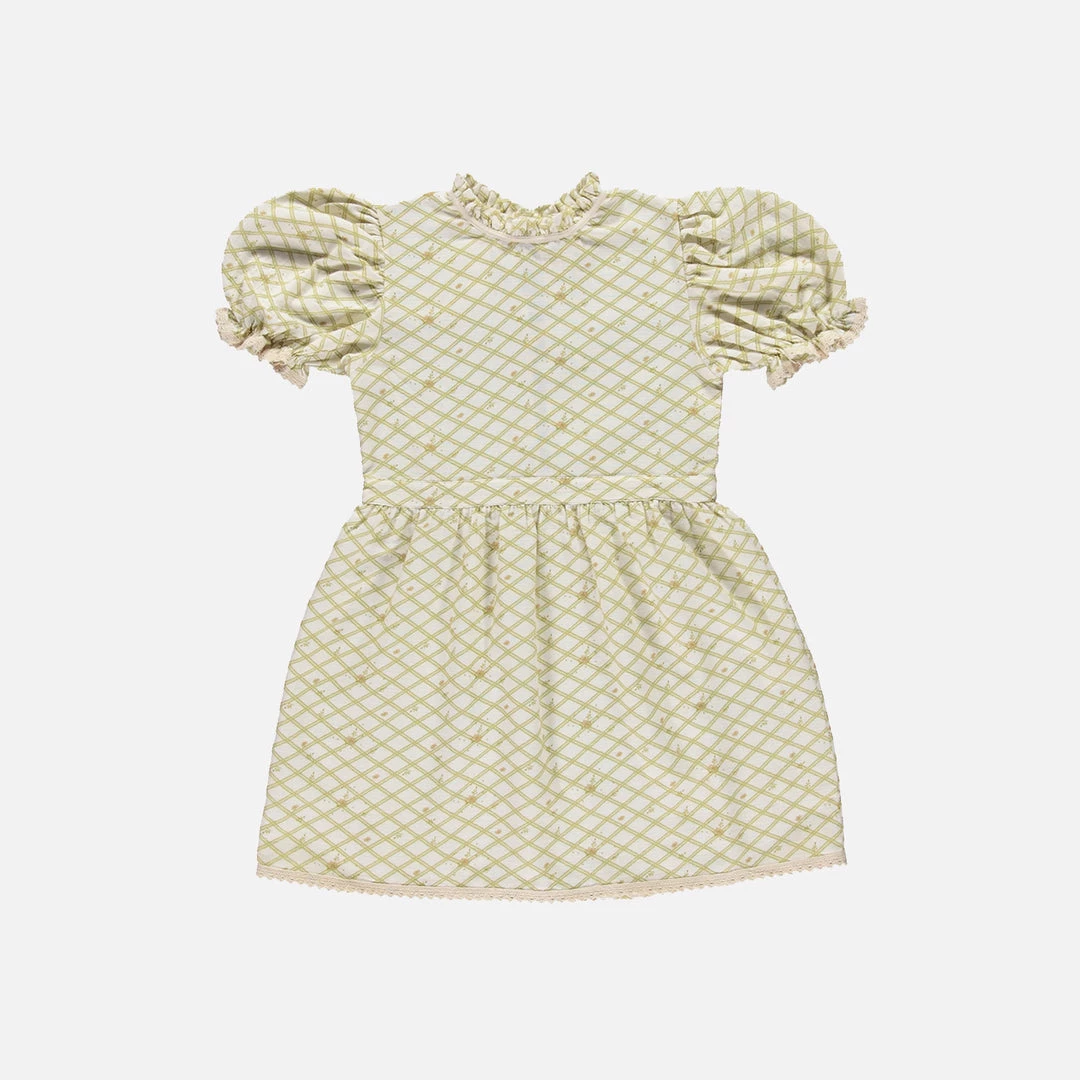 The Bonita dress is designed with short puff sleeves and a ruffle neckline. It is closed with three string ties on the back adding a sweet detail to the dress. Length just above the knee. Lightweight woven in organic cotton.