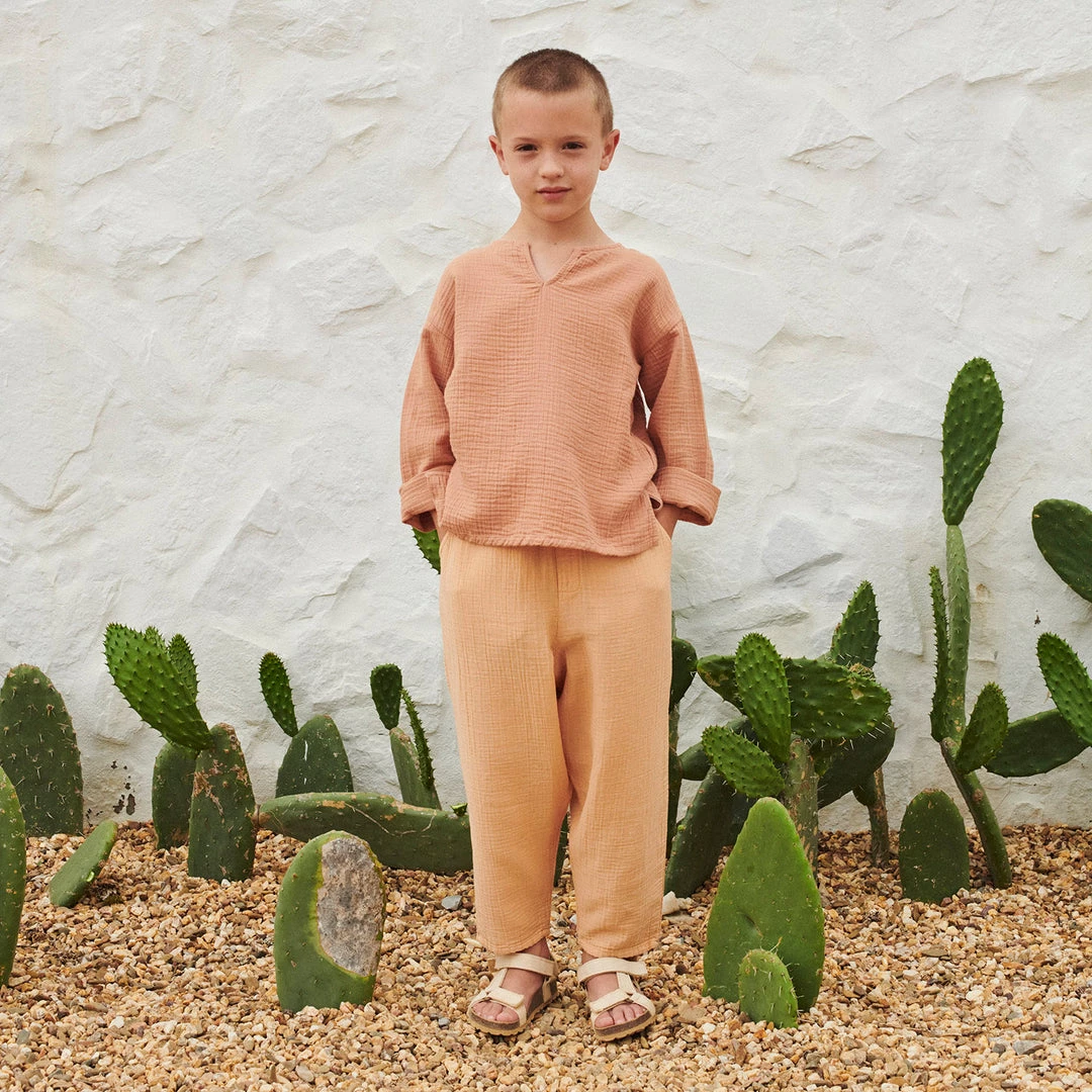 The Leonardo shirt is made from Liilu’s signature organic cotton muslin, super soft and easy to wear. Features v-neck detail at the front, easy to style with almost anything.