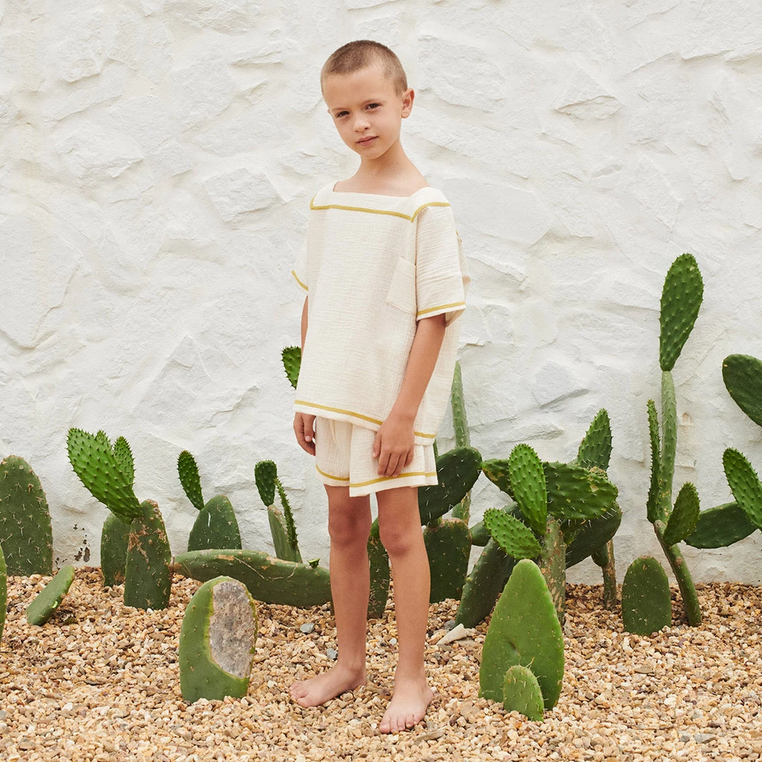 The Pepijn pyjamas are super soft and perfect for warm summer nights. Can be worn as a pyjama or styled as a relaxed summer outfit. Comfortable and breathable, made in a cotton muslin. This style is also available for women.Â