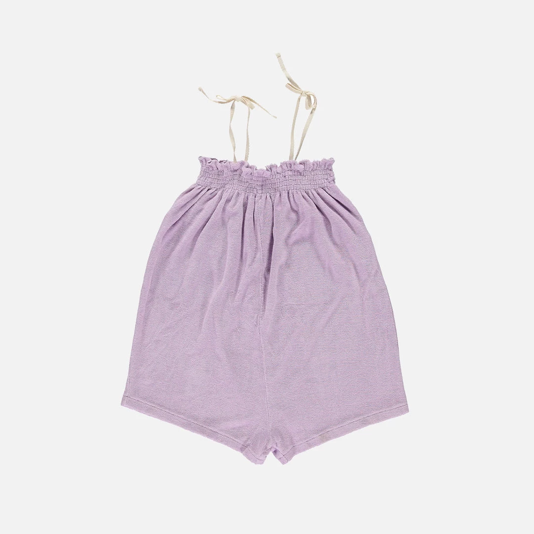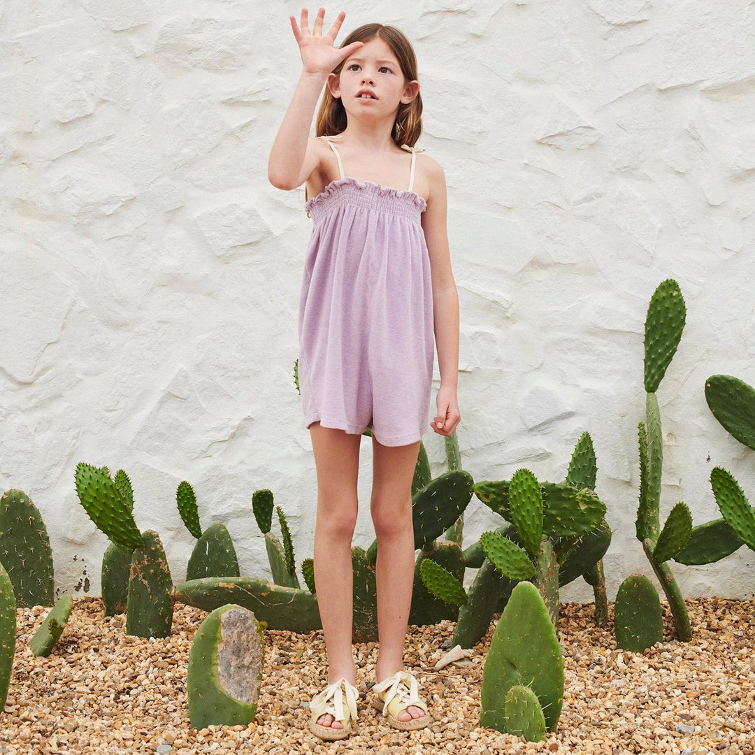 Super soft playsuit with shoulder string ties for a comfortable and adjusted fit. Features an elasticated straight neckline. Easy to style as a playsuit on warm summer days and can be layered when needed. Knitted in a soft organic cotton terry.