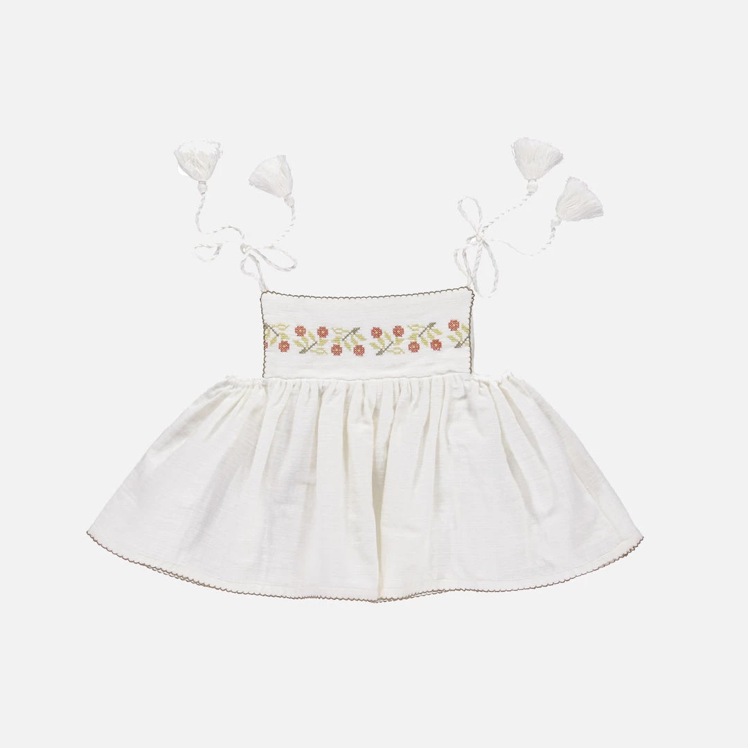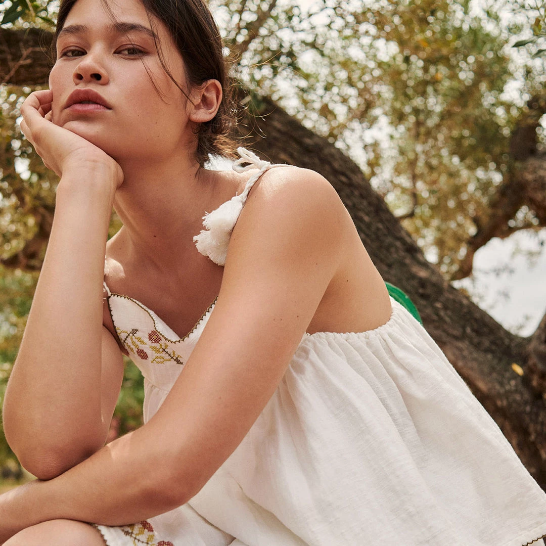 Beautiful Folk top from Liilu featuring this season’s embroidery at the front. Woven in a lightweight organic cotton, perfect for summer. The shoulder string ties are adjustable for a comfortable fit and features tassels at the ends. This top is truly a summer essential.