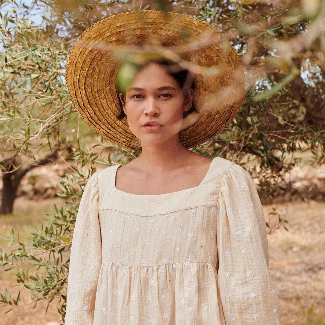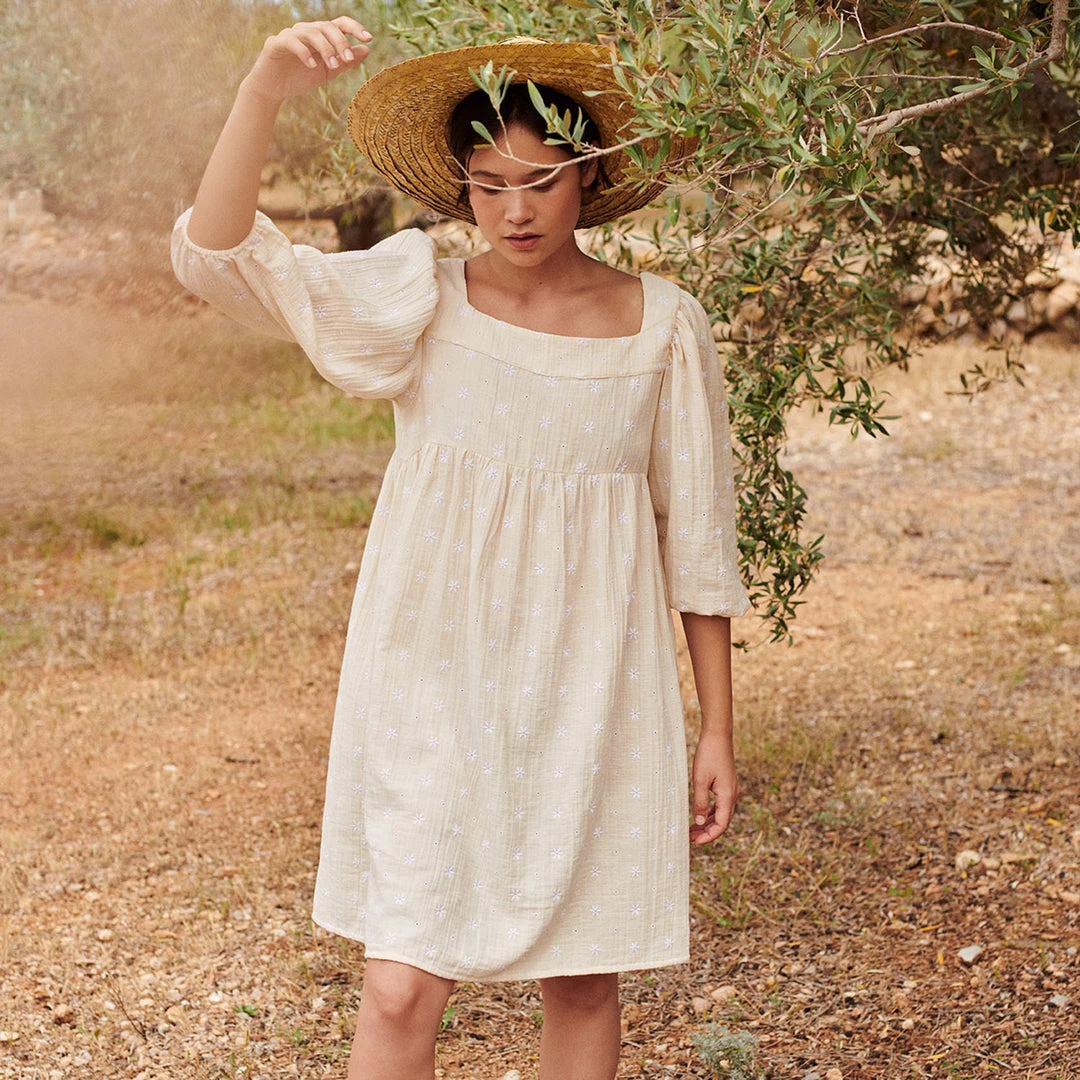 The Marlene dress features ballon sleeves with a flattering square neckline. Length falls just above the knee. Features an embroidered flower motive and made in a soft cotton muslin.