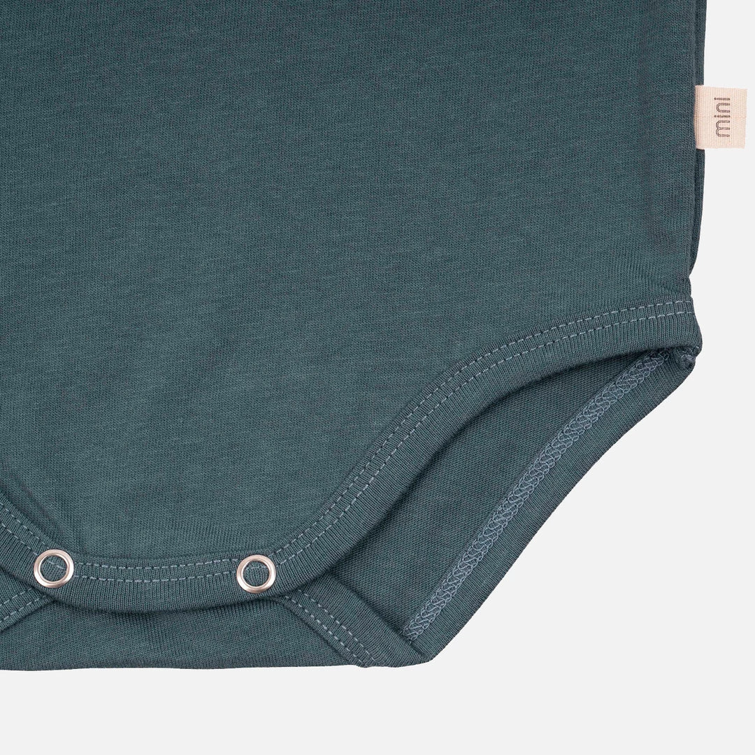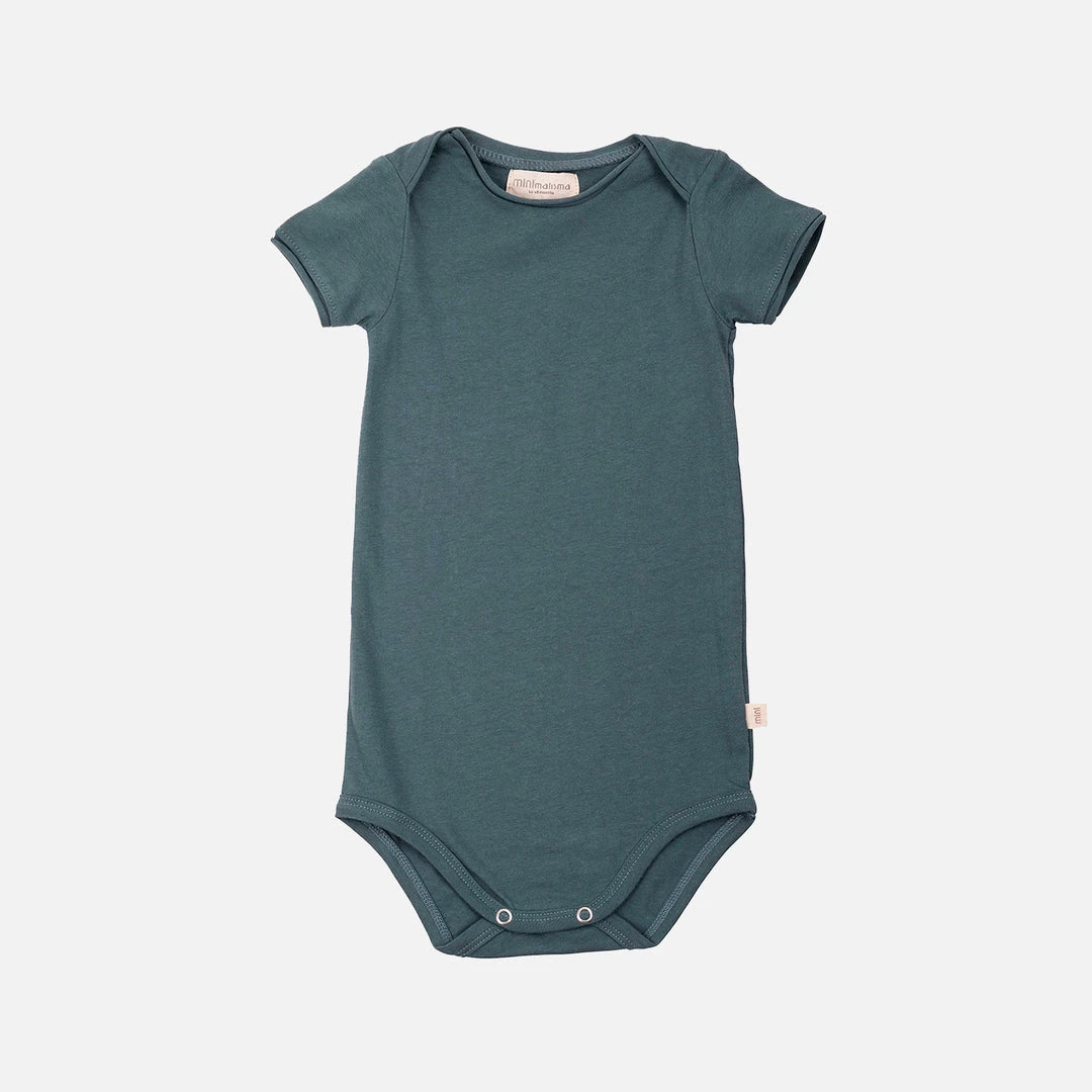 Soft short-sleeve body with envelope neck-opening. The sleeve and neck opening have rolling raw edges. The body features two YKK popper fasteners, nickel free.
