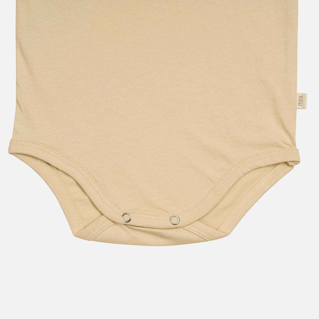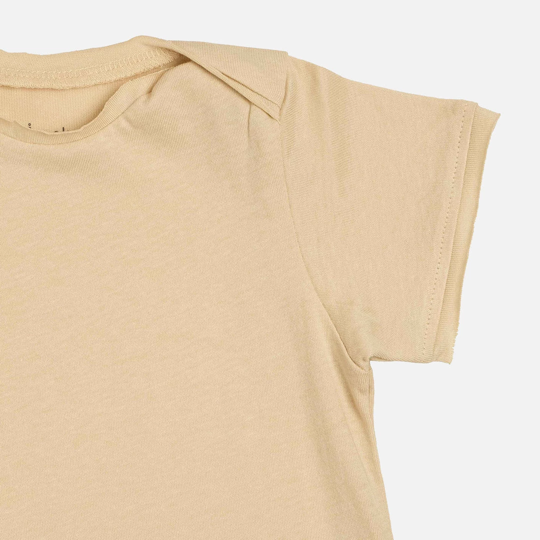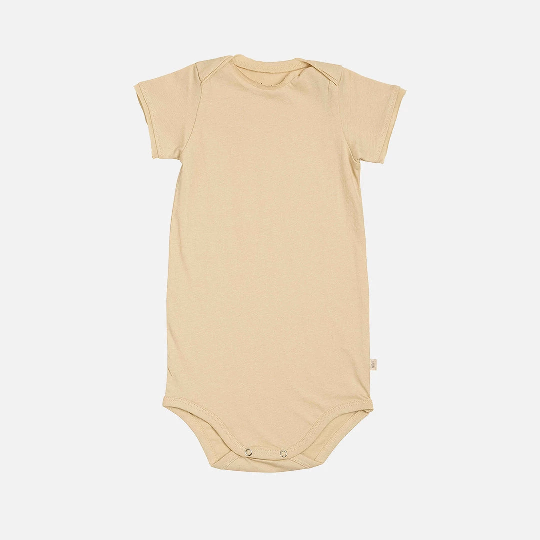Soft short-sleeve body with envelope neck-opening. The sleeve and neck opening have rolling raw edges. The body features two YKK popper fasteners, nickel free.