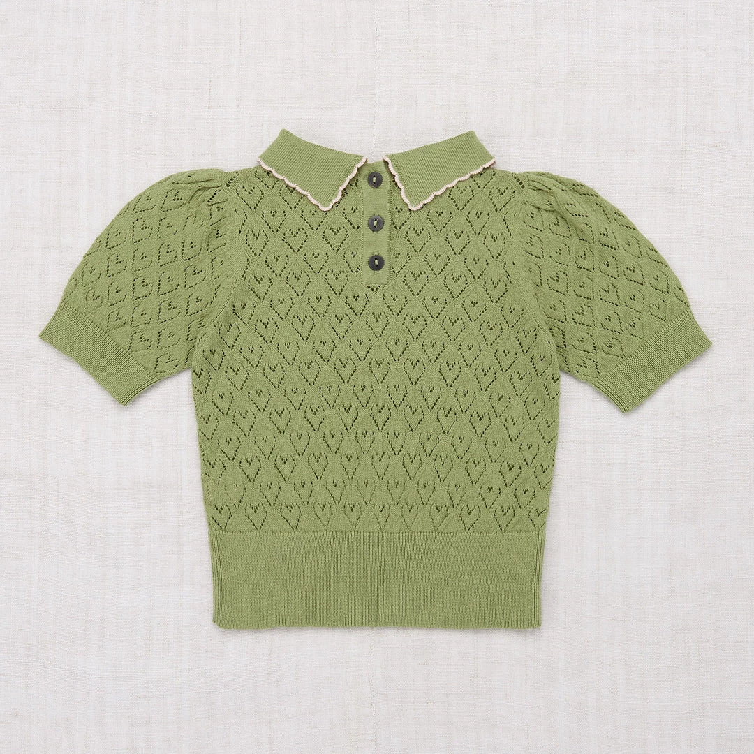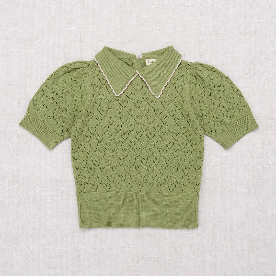 The Joanna blouse is a new style for us this season. It features short puff sleeves and a sweet collar with a contrasting edge detail. The knit has a pattern which adds a bit of texture. Designed with natural horn buttons at the back neck.