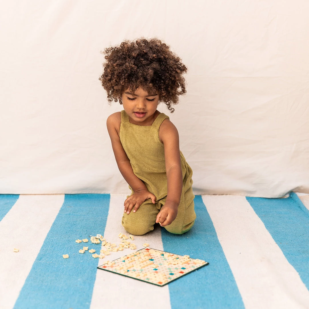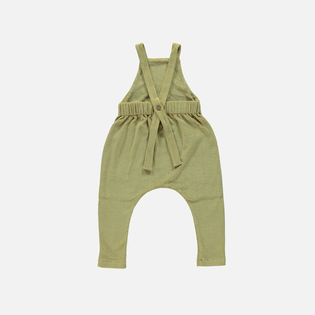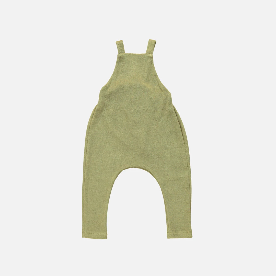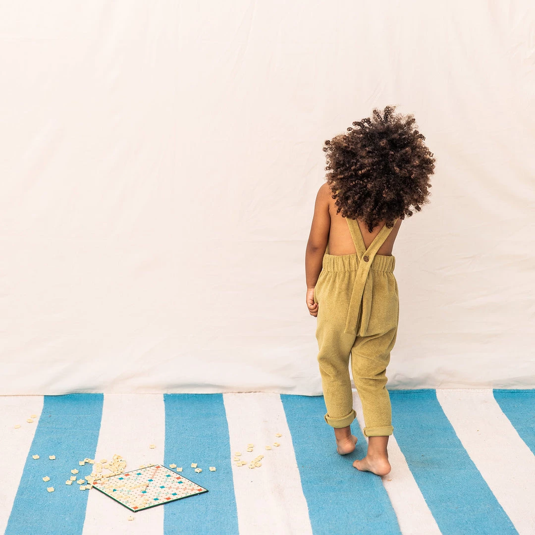 Comfortable dungarees, a classic for warmer days. Featuring a loose fit and adjustable straps with a coconut button on the back. Multiple button holes allow it to grow with your child.