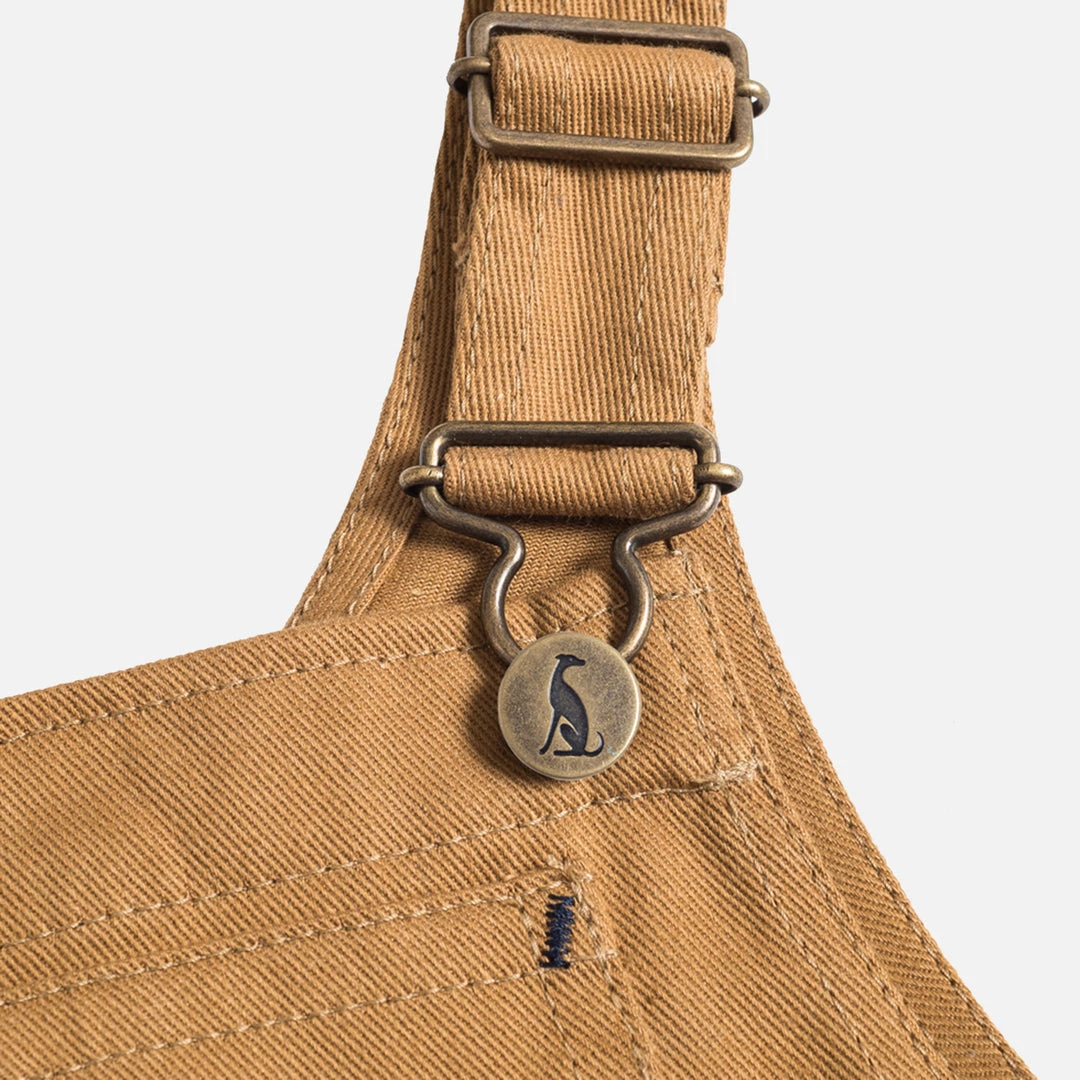 DESIGN: High backed Front bib with pocket Two slanted side pockets Two mitred back pockets Navy bar tacks on pockets for reinforcement  Antique brass nickel free hardware and fastenings with soft edges for comfort Branded Antique brass button side fastening Adjustable straps for longer wear Navy herringbone tape inside hem cuff for rolled up hem and extended wear Branded “Monty” woven flag label at back pocket Twin needle stitching for durability Fell flat seam at centre back for strong construction
