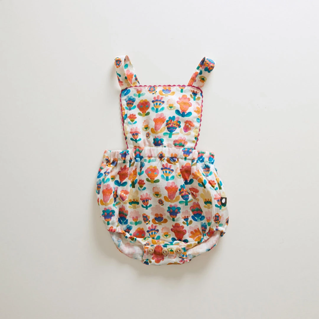 A fun statement summer romper, with a bold multicoloured flower print. Perfect worn on its own on the warmest days and can be layered when needed. Made from the softest linen, this romper is perfect for summer.