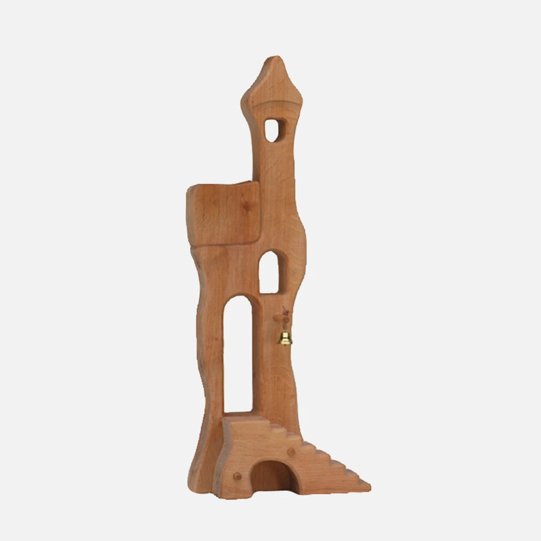 A bell tower on several levels, with a village feel. Children can imagine a medieval mountain village, castle or fairy tale world of passageways, attics and dormers, with a mysterious bell tower crowning over all.